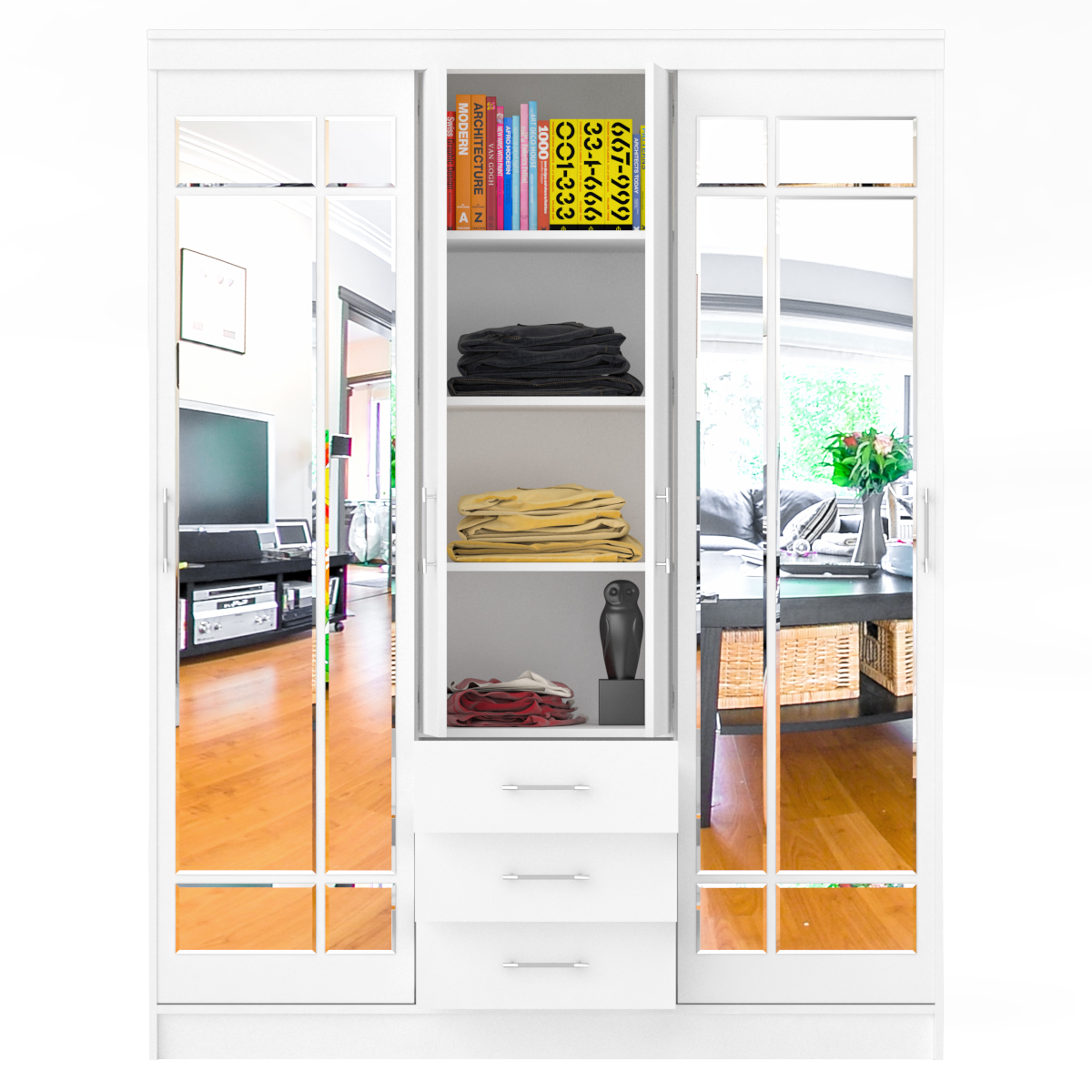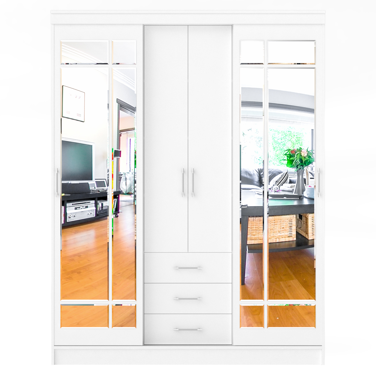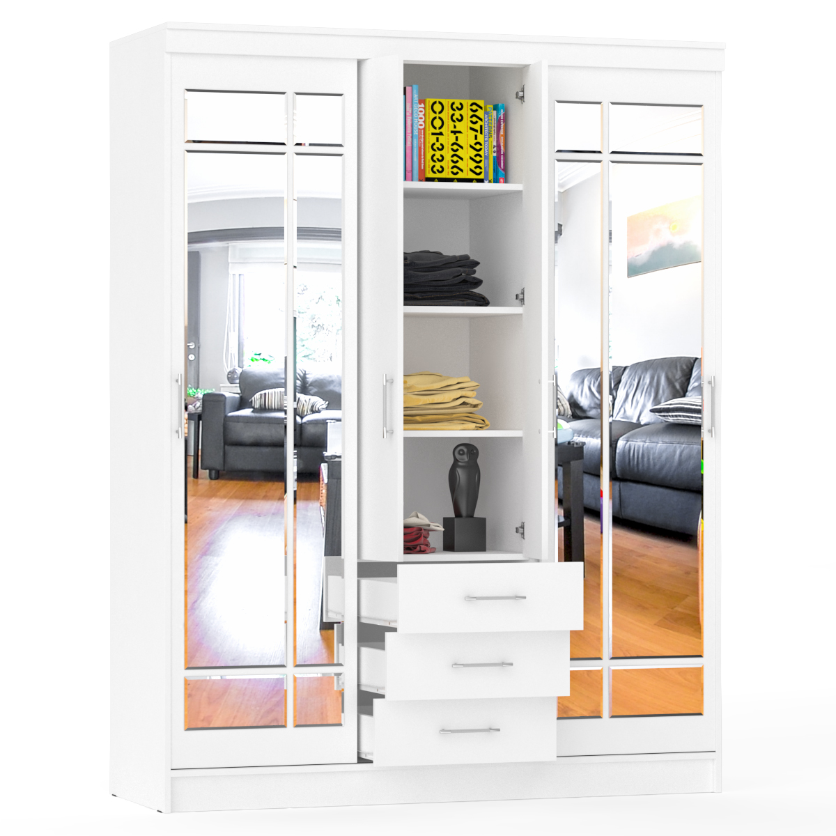 Экономия пространства, продуманная эргономика и вместимость - эти свойства шкафов-купе присутствуют в модели СВК-1700 в высшей степени. Конструктивно шкаф-купе совмещает в одном предмете мебели - два отделения-купе, распашное отделение и мини-комод. Отделения-купе, расположенные по бокам шкафа, оснащены штангой для хранения одежды на вешалках и антресольной полкой. Раздвижные дверки шкафа-купе обеспечивают быстрый и удобный доступ в вещам, и гораздо травмобезопаснее в эксплуатации. В центре шкафа-купе находится, за двумя глухими распашными дверками - бельевое отделение с тремя полками. Мини-комод с тремя выдвижными ящиками, установленными на шариковые направляющие, занимает нижнее, центральное положение. Основа дизайна данной модели шкафа-купе - интересное сочетание древесной структуры и респектабельная строгость линий. Шкаф-купе роскошно декорирован зеркальными вставкими с фацетом на раздвижных дверках, стильными ручками. Классический стиль шкафа-купе гармонично дополнит ансамбль гостиной, прихожей, спальни, а обилие зеркал - добавит воздуха и света. Красота и функциональность шкафа в сочетании с отличным качеством исполнения, обещают удовольствие на долгие годы. Фурнитура высоких стандартов. Корпус и фасады выполнены из ЛДСП 16 мм., края закромлены плёнкой ПВХ. Поставляется в разобранном виде, надёжно упакованным, в комплекте с фурнитурой и инструкцией по сборке.
