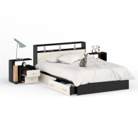 Компактная двуспальная кровать с трёхсторонним доступом к спальному месту размером 1400х2000 мм и изголовьем с хромированными стойками. В основании кровати расположены два вместительных ящика для хранения постельных принадлежностей и личных вещей. Предусмотрена универсальная схема сборки бельевых ящиков - они могут быть установлены с правой или с левой стороны кровати. Основание под матрас в комплекте кровати (настил ДСП), матрас приобретается отдельно. Набор мебели включает две прикроватные тумбы - в правом исполнении (выдвижные ящики расположены слева) и левом (ящики - справа). Классическая форма тумб с двумя вместительными ящиками дополнена узкой открытой нишей и верхней полочкой. Фурнитура высоких стандартов. Ящики закреплены на металлических роликовых направляющих, обеспечивающих прямой, лёгкий ход. Корпус и фасады выполнены из ЛДСП, края закромлены плёнкой ПВХ, хромированная труба 25 мм. Поставляется в разобранном виде, надёжно упакованным, в комплекте с фурнитурой и инструкцией по сборке. Элементы из набора мебели для спальни Камелия.