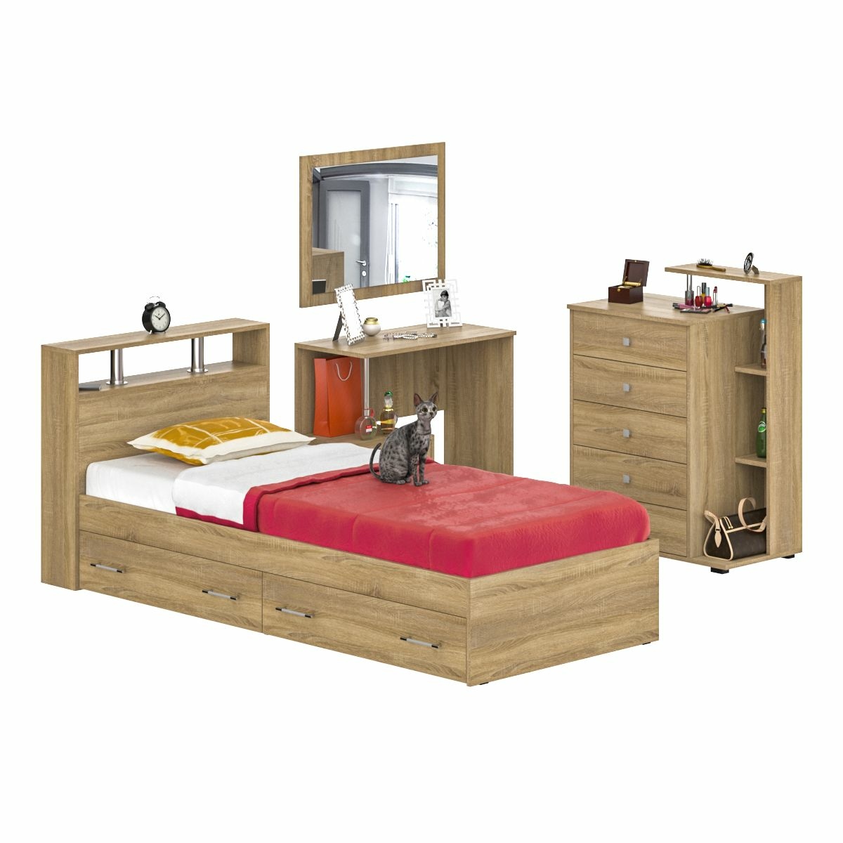 Спальня состоит из кровати с ящиками 900, стола косметического с зеркалом и комода - островок безмятежного наслаждения! Удобная кровать с трёхсторонним доступом к спальному месту размером 900х2000 мм - стильный подиум для комфортного отдыха. В основании кровати расположены два вместительных ящика для хранения постельных принадлежностей и личных вещей. Предусмотрена универсальная схема сборки бельевых ящиков - они могут быть установлены с правой или с левой стороны кровати. Основание под матрас в комплекте кровати (настил ДСП), матрас приобретается отдельно. Компактный столик, глубиной всего 40 см., с двумя выдвижными ящиками, открытой нишей и удобной столешницей на хромированной стойке. Ящики и стойка расположены с левой стороны стола. Универсальная сборка не предусмотрена. Большое, нарядное зеркало повысит уровень комфорта в спальне, оживит интерьер магией блеска и света. Классическая форма комода с пятью выдвижными ящиками креативно дополнена узкой открытой нишей с тремя полками и верхней полочкой. Ящики расположены с левой стороны комода. Универсальная сборка не предусмотрена. Фурнитура высоких стандартов. Ящики закреплены на металлических роликовых направляющих, обеспечивающих прямой, лёгкий ход. Выполнена из ЛДСП, края закромлены плёнкой ПВХ, хромированная труба 25. Поставляется в разобранном виде, надёжно упакованным, в комплекте с фурнитурой и инструкцией по сборке.