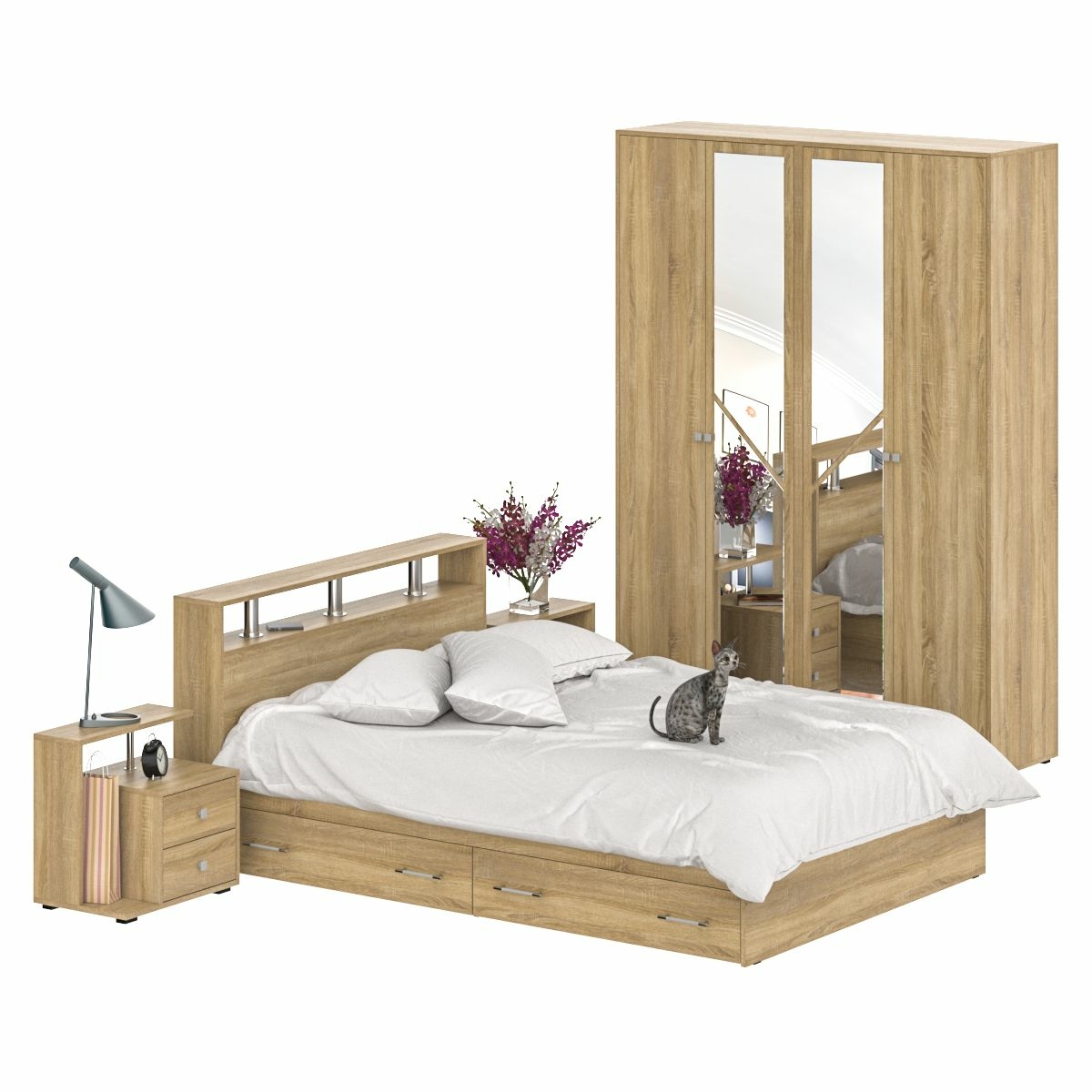 Мебель для спальни состоит из кровати с ящиками 1400, двух тумб и шкафа 4-х створчатого. Удобная кровать с трёхсторонним доступом к спальному месту размером 1400х2000 мм. - стильный подиум для комфортного отдыха. В основании кровати расположены два вместительных ящика для хранения постельных принадлежностей и личных вещей. Предусмотрена универсальная схема сборки бельевых ящиков - они могут быть установлены с правой или с левой стороны кровати. Основание под матрас в комплекте кровати (настил ДСП), матрас приобретается отдельно. Комплект из двух прикроватных тумб в правом и левом исполнении - креативный подход к оформлению зоны отдыха. Стильная и эргономически оправданная конструкции тумб добавит интерьеру модного щегольства, а семейной паре удовольствие комфорта. Роскошный и вместительный шкаф 4-х створчатый - очарование интерьера и радость Хозяйки! Широкий шкаф 4-х створчатый составлен из двух автономных шкафов, которые можно устанавливать отдельно, где Вам удобно! Одно отделение шкафа - для одежды на вешалках, со штангой и двумя полками, второе - для белья и вещей, с четырьмя полками. Центральные дверки шкафа украшены зеркалами во всю длину двери - дополнительный вклад в эстетику и комфорт спальни. Универсальная сборка шкафа 4-х створчатого Камелия позволяет легко изменять интерьер, без уменьшения декоративности. Фурнитура высоких стандартов. Ящики закреплены на металлических роликовых направляющих, обеспечивающих прямой, лёгкий ход. Выполнена из ЛДСП, края закромлены плёнкой ПВХ, хромированная труба 25. Поставляется в разобранном виде, надёжно упакованным, в комплекте с фурнитурой и инструкцией по сборке.