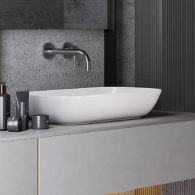 Накладной умывальник популярного размера - 60 см. Имеет мягкие округлые черты, вокруг чаши остается достаточно пространства, чтобы раставить аксессуары.