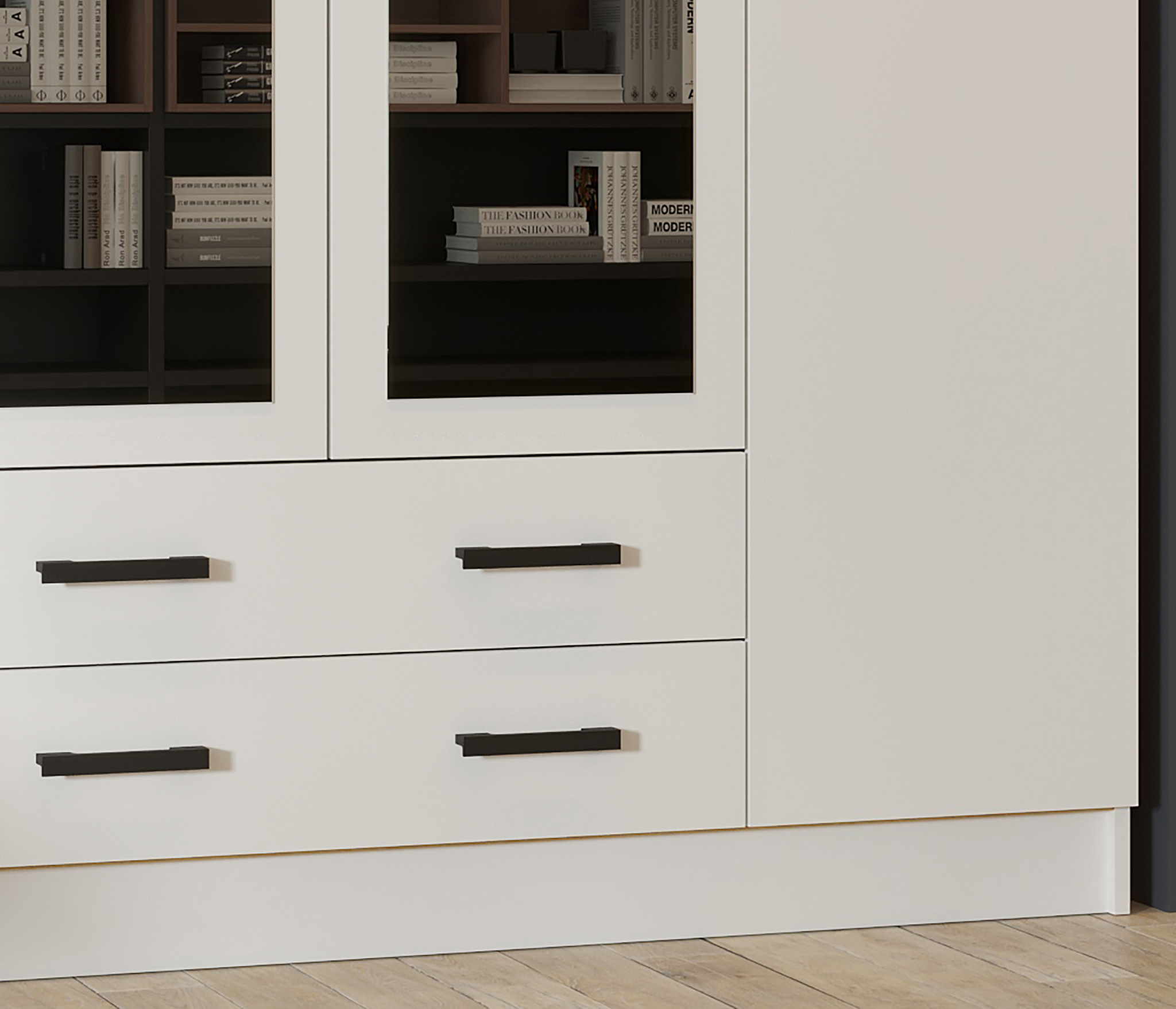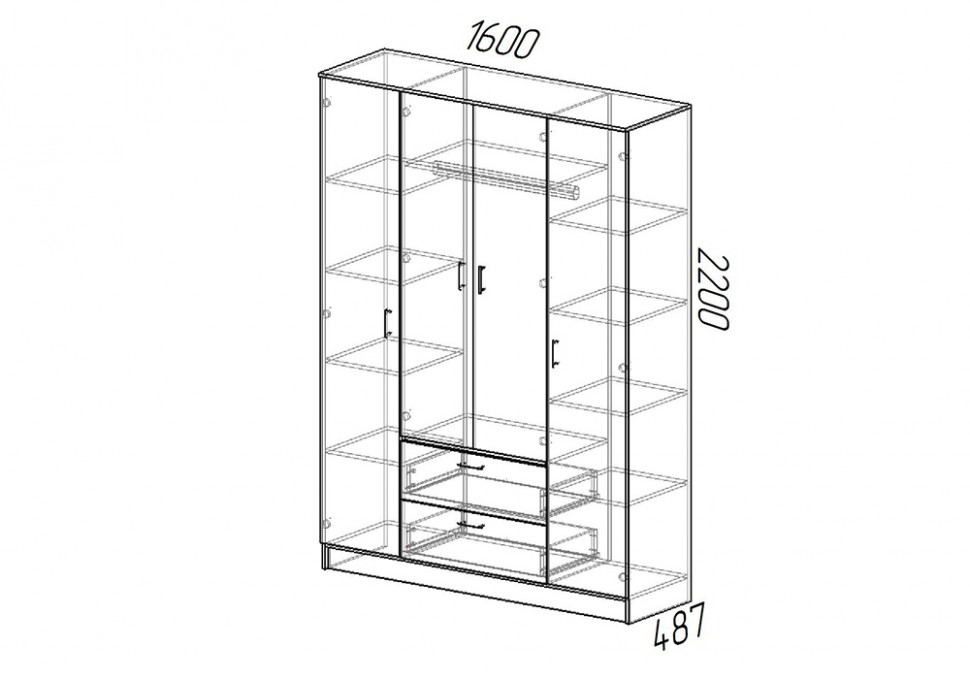 Большой распашной шкаф КВАДРО подарит вашему дому удобную систему хранения и визуально расширит пространство помещения, благодаря зеркалам на двух центральных дверцах. Функциональная и продуманная система хранения представлена двумя вертикальными секциями полок, парой широких выдвижных ящиков и отделением со штангой для вешалок.