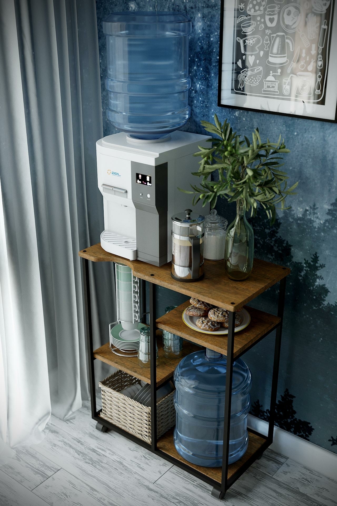 Современное направление Лофт - это простое и одновременно стильное оформление, где практичность сочетается с оригинальным исполнением. Подставка для воды «УОТЕР LOFT», выполненная в данном стиле, безусловно подчеркнет стилистику помещения. Сборно-разборный каркас подставки изготовлен из профильной трубы 15*15 мм, полки выполнены их экологичного материала МДФ. Данную подставку можно использовать и для кулера, и для бутыли, и сочетать бутыль с кулером и дополнительной бутылью, т.е. многофункциональность данной подставки позволяет использовать её как дома, в офисе или любом помещении для удобного и грамотного размещения воды. Основание подставки на роликовых опорах. Цветовая гамма подставки дополняет основную стилистику: влагостойкое декоративное покрытие, стилизованное под камень и дерево, безусловно придаст оригинальности и эстетики интерьеру.