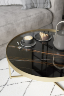 Журнальный столик ""Ориндж""– лаконичная модель в современном стиле с элементами ар-деко и неоклассики, которая благодаря своему универсальному дизайну прекрасно впишется в любой домашний или офисный интерьер и украсит собой диванную зону. Прочная конструкция столика полностью изготовлена из металла в цвете черный, хром или золото. Круглая столешница выполнена в стекле с УФ-печатью, которое эффектно преломляет как искусственное, так и естественное освещение, а красота мраморного рисунка мгновенно приковывает взгляд и завораживает, создавая яркий акцент.