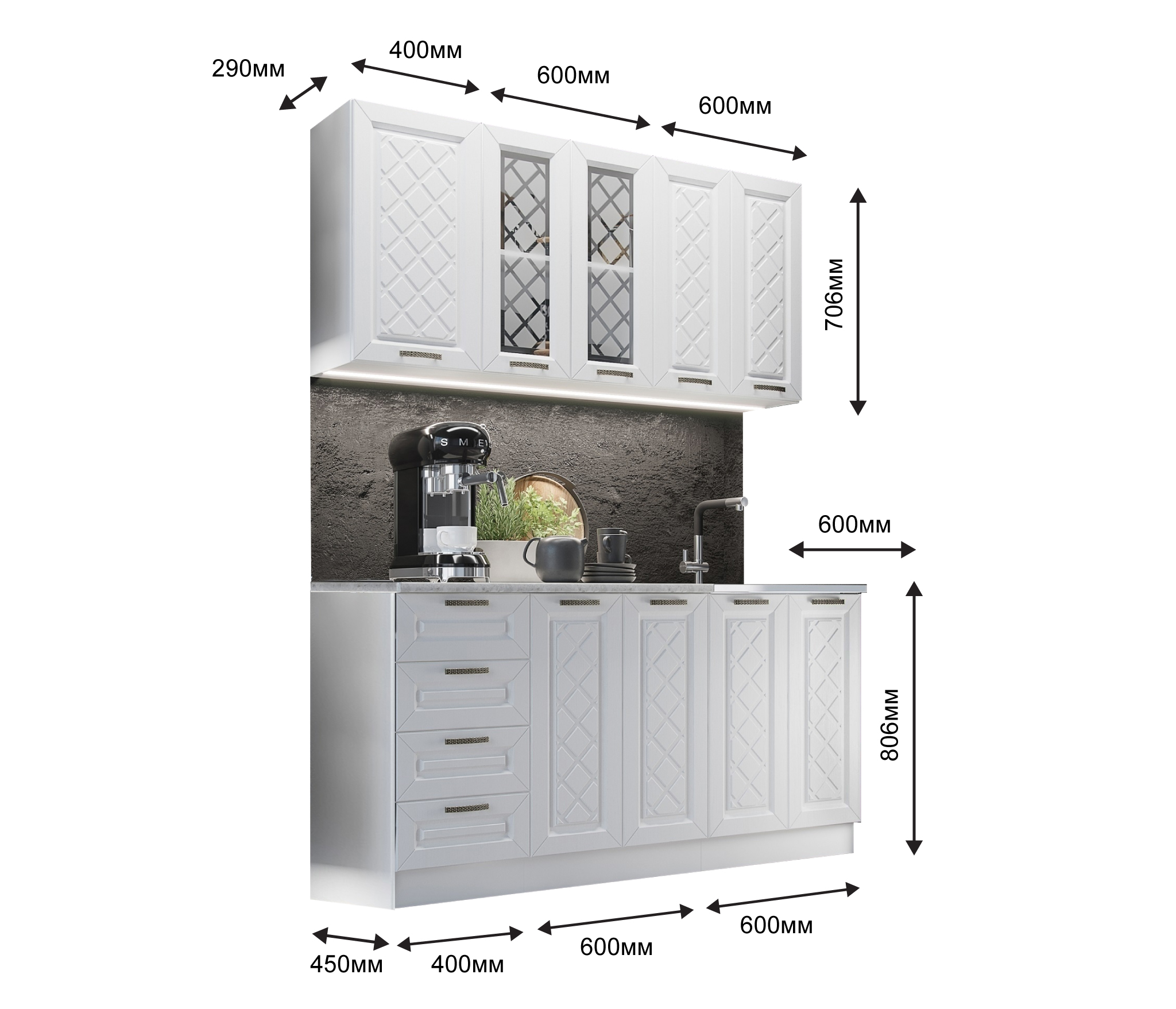 Глубина верхних и нижних шкафов указана с учетом фасада.