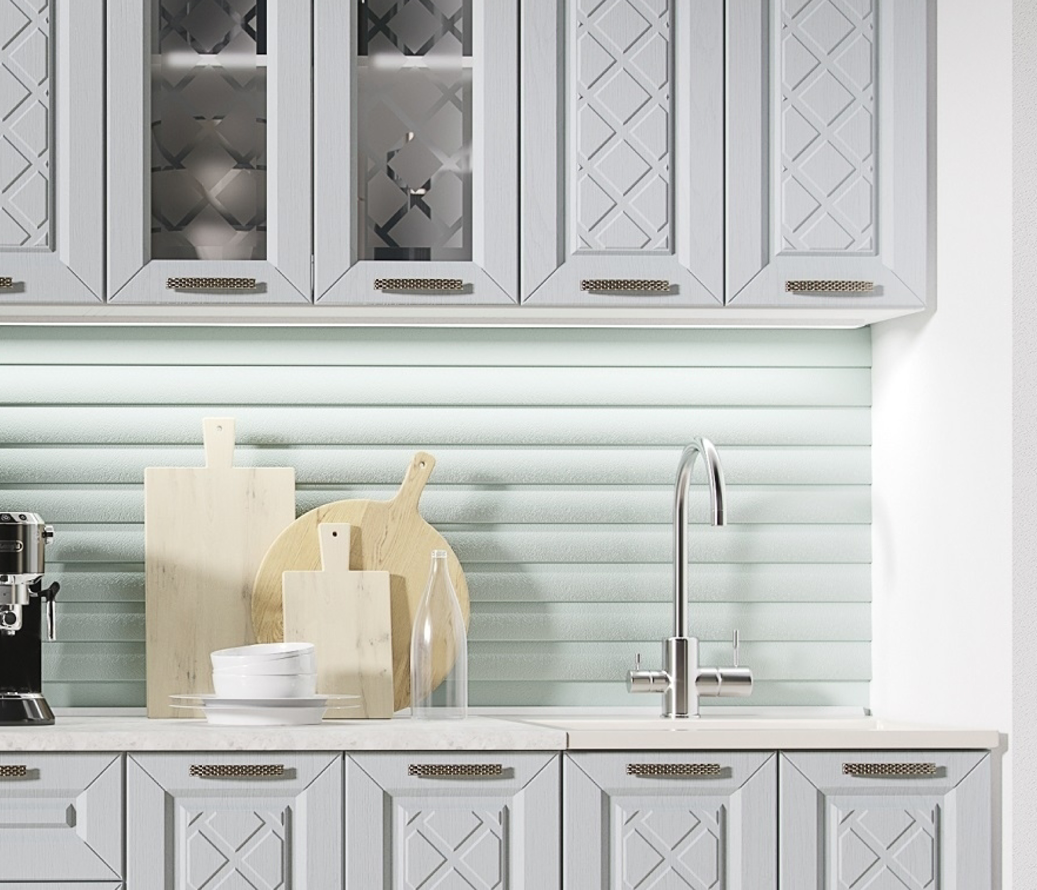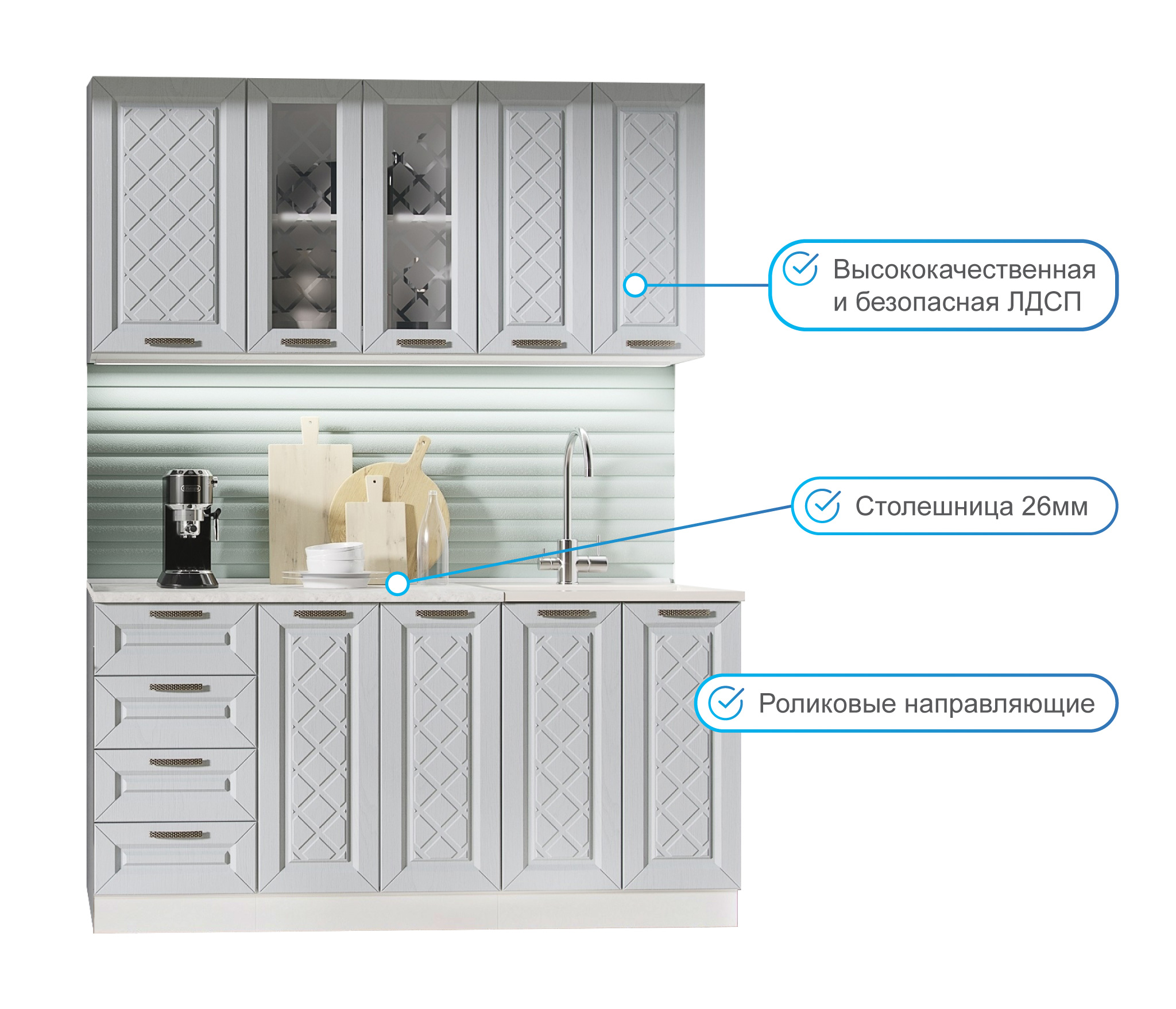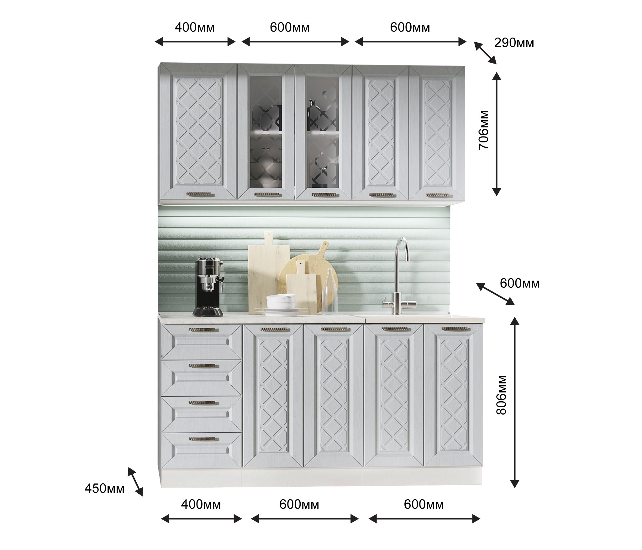 Глубина верхних и нижних шкафов указана с учетом фасада.