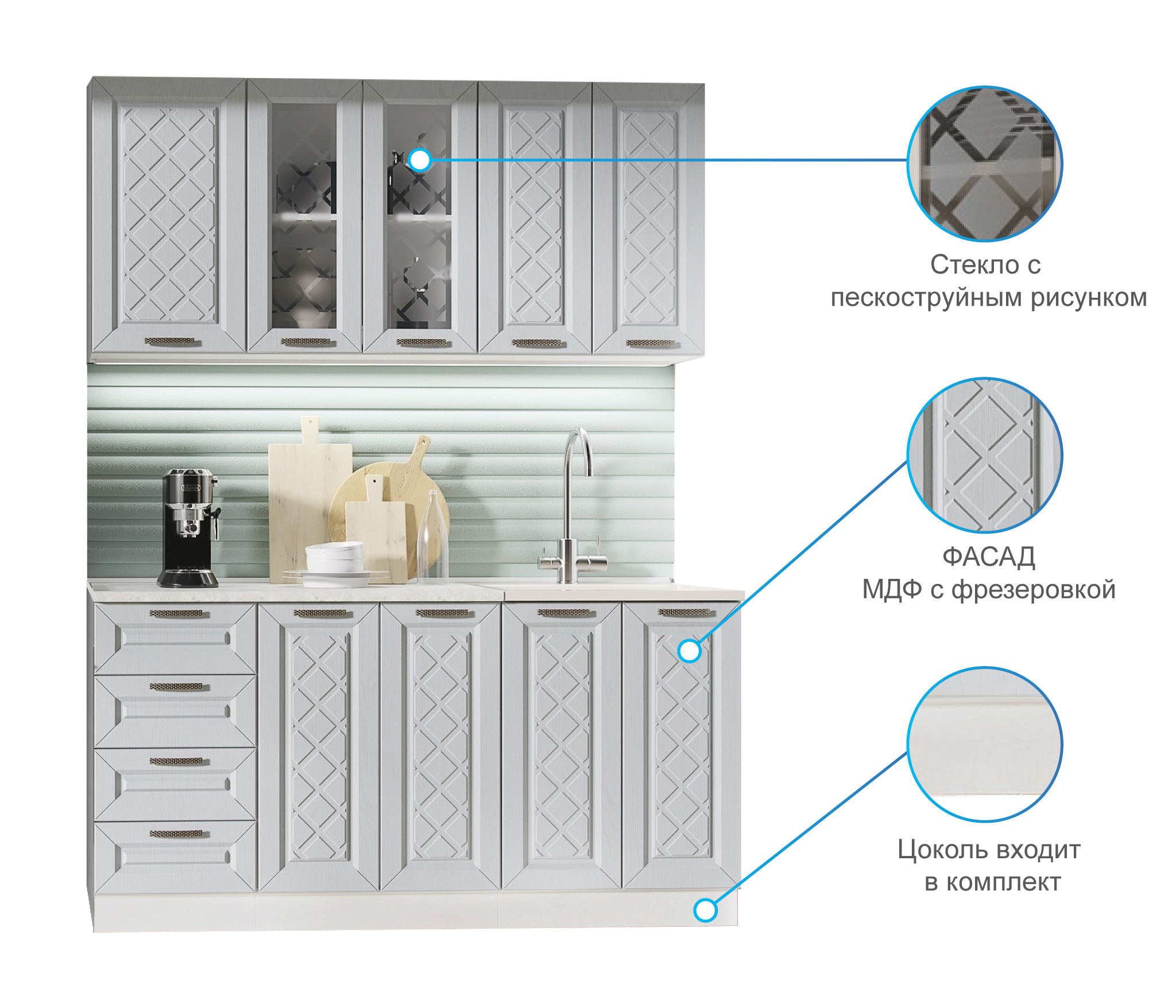 Высота нижних модулей указана с учетом столешницы, кроме модуля М600 под мойку. Мойка в комплект не входит и приобретается отдельно.