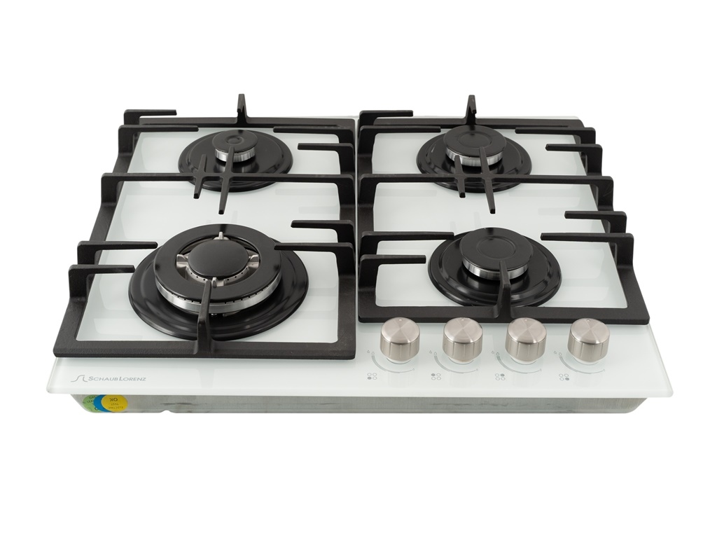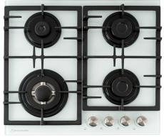 Газовая варочная поверхность закалённое стекло, Ширина 60 см, 4 газовые конфорки, 1 экономичная конфорка (0,9 кВт), 2 стандартные конфорки (1,7 кВт), 1 ВОК конфорка(3,5 кВт), Автоподжиг, Чугунные решетки, Жиклёры для баллонного газа, Газ-контроль, Цвет: белое стекло.