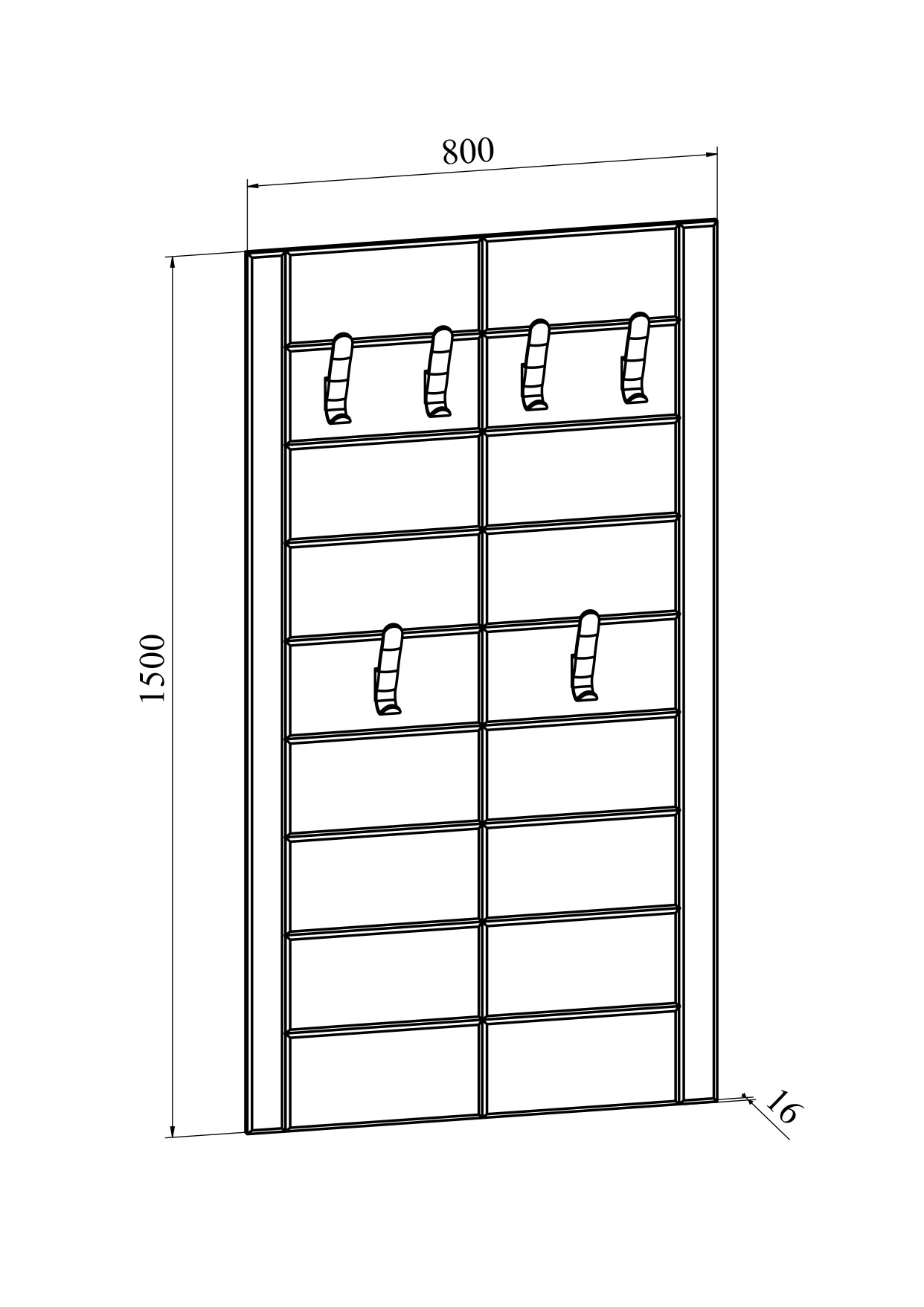Вешалка Изабель ИЗ-80 станет прекрасным дополнением интерьера вашей прихожей. Шесть крючков на разной высоте предназначены для размещения верхней одежды, зонтов и других аксессуаров.Важная информация.Мебель доставляется в разобранном виде, в упаковках.Размеры модуля (ш/в/г) вмм: 800х1500х16.Материал: ЛДСП, МДФ.