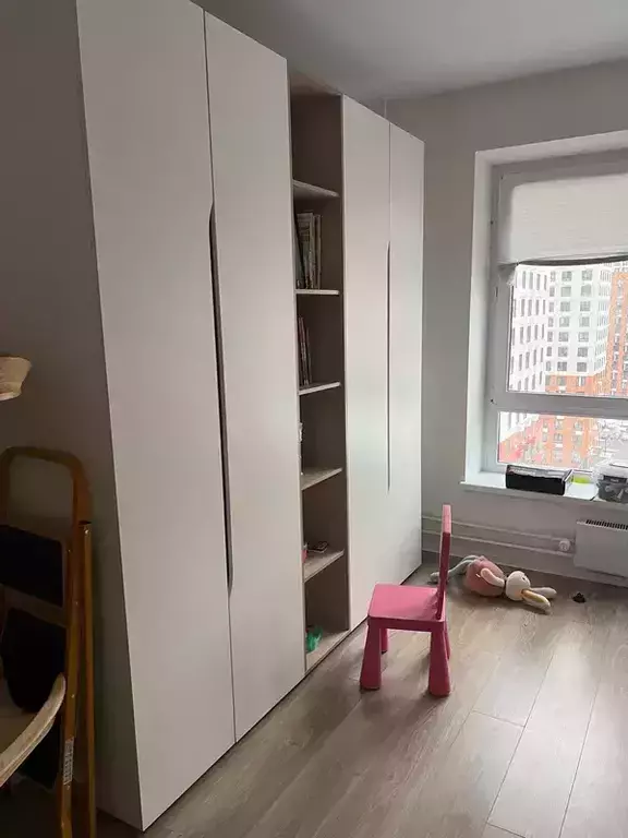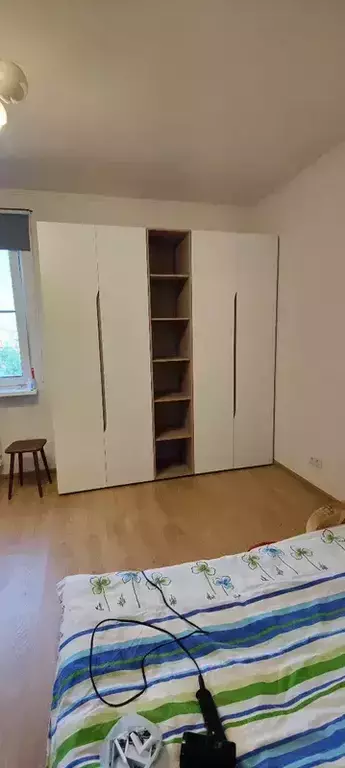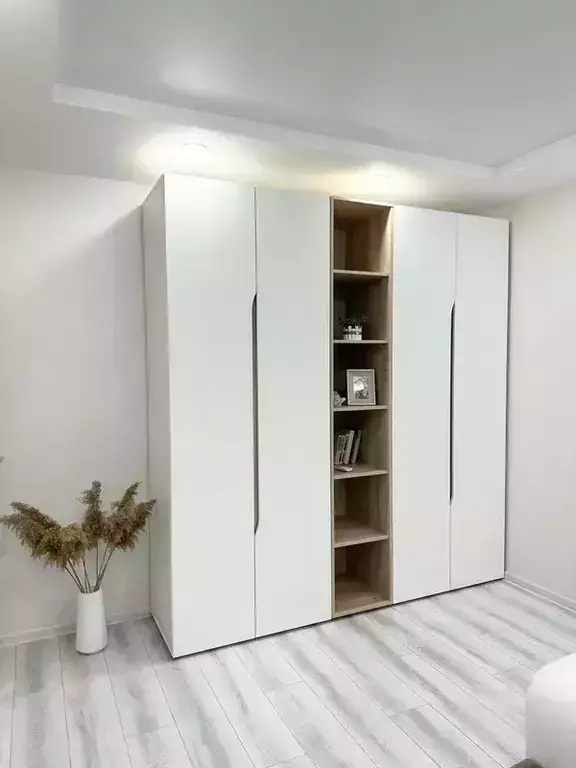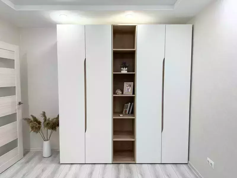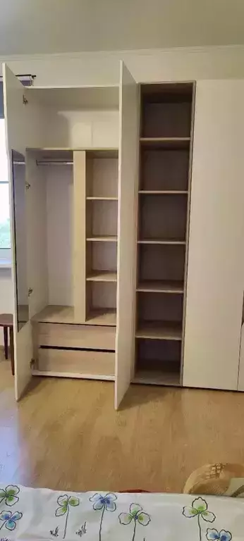 Открытый стеллаж и два шкафа для одежды Муссон - компактная и вместительная система хранения для небольшой спальни.