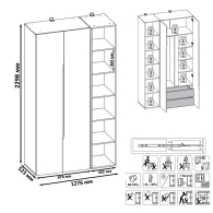 За распашными дверками шкафа оборудованы три отделения - нижнее с ящиками, верхнее с антресольной полкой и центральное со штангой для одежды на вешалках и полками. Два вместительных внутренних ящика на шариковых направляющих послужат отличным комодиком для деликатных вещей и белья. Центральное отделение со штангой для одежды на вешалках и полками может быть собрано на любую сторону. На обратной стороне двери размещается зеркало. У фасадов нет фурнитуры, она заменена стильными ручками-вырезами. Вырезы делают внешний вид изделий асимметричным, что делает композицию современной и динамичной. Стеллаж оборудован пятью поками для хранения вещей и элементов декора. Установлены на пластиковые опоры защищая поверхность пола от механических повреждений. Выполнен из прочной ламинированной ДСП 16 мм, торцы деталей закромлены плёнкой ПВХ 0,4-2 мм. Поставляются в разобранном виде, надёжно упакованной в гофрокартон, с приложенной подробной инструкцией по сборке. Шкаф двухстворчатый с открытым стеллажом Муссон - элементы из набора мебели для спальни Муссон.