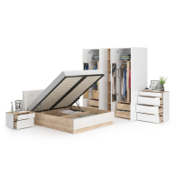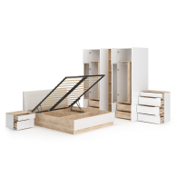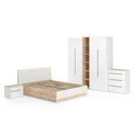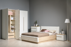 В этот комплект входит 6 предметов мебели - двуспальная кровать Муссон 11.28, прикроватная тумба, два шкафа двухстворчатого 13.198 со стеллажом 13.349 и комодом. Выбирая двуспальную кровать Муссон, Вы выбираете крепкий сон и уют. Объёмная прямоугольная стежка на изголовье и изножье, украшенная рядом пуговиц, добавляют кровати Муссон визуальной гармонии. Изголовье кровати установлено с небольшим наклоном, что позволит в комфортной позе читать или сидеть на кровати. Обивка кровати выполнена из модной, удобной в эксплуатации искусственной кожи. Мягкими элементами у кровати являются изножье и изголовье. Комбинация сочетания цвета кровати с нежными светлыми акцентами обивки придают мебели выразительную элегантность. Корпус кровати оборудован подъемным ортопедическим основанием, которое обеспечивает доступ к трем коробам для белья. Спальное место размером 1600х2000 мм. Матрас для этой кровати преобретается отдельно. Тумбочка прикроватная оборудована двумя удобными выдвижными ящиками на шариковых направляющих полного выдвижения. Установлена тумба прикроватная Муссон 16.03 на пластиковые опоры защищая поверхность пола от механических повреждений. Не универсальная сборка - собирается только так, как представлено на изображениях. За распашными дверками шкафа (в комплектации 2 шт.) оборудованы три отделения - нижнее с ящиками, верхнее с антресольной полкой и центральное со штангой для одежды на вешалках и полками. Два вместительных внутренних ящика на шариковых направляющих послужат отличным комодиком для деликатных вещей и белья. Центральное отделение со штангой для одежды на вешалках и полками может быть собрано на любую сторону. На обратной стороне двери размещается зеркало. Стеллаж оборудован пятью поками для хранения вещей и элементов декора. Компактный комод с четырьмя вместительными выдвижными ящиками на шариковых направляющих полного выдвижения. Лицевую фурнитуру заменяет стильный вырез, за которым видно древесный декор корпуса. Вырезы делают внешний вид изделий асимметричным, что делает композицию современной и динамичной. Мебель выполнена из прочной ламинированной ДСП 16 мм, торцы деталей закромлены плёнкой ПВХ 0,4-2 мм. Поставляется в разобранном виде, надёжно упакованной в гофрокартон, с приложенной подробной инструкцией по сборке.