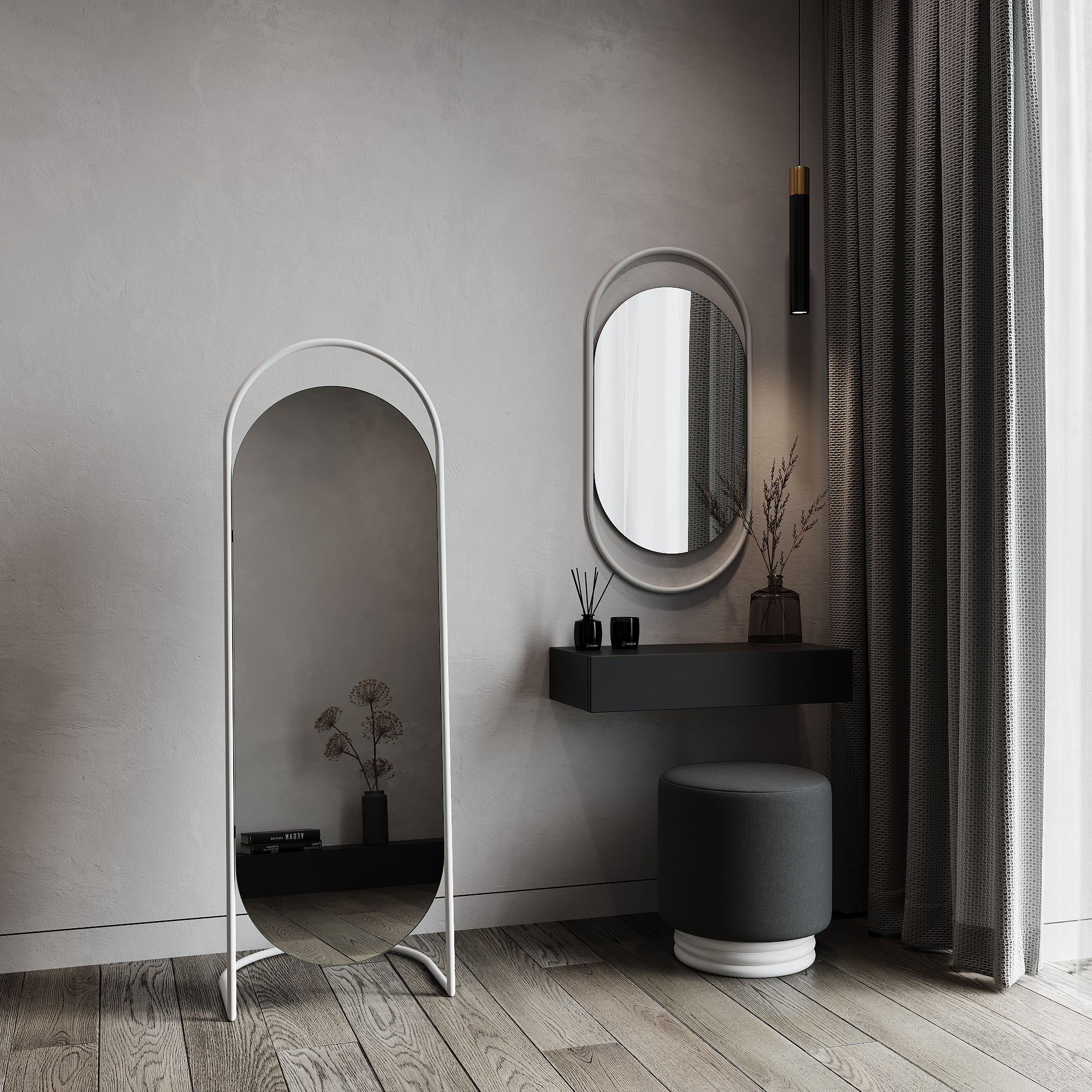 Дизайнерское напольное зеркало в полный рост в металлической овальной раме ручной работы выполнено в минималистичном стиле. Простая изысканность форм и современный дизайн делает его уместным практически в любом интерьере. Оно может быть установлено в спальне, прихожей, гостиной, где за счёт своих внушительных размеров способно расширить пространство и создать иллюзию источника освещения. Наклон зеркала оптимальный фиксированный, что позволяет отражать любой рост.