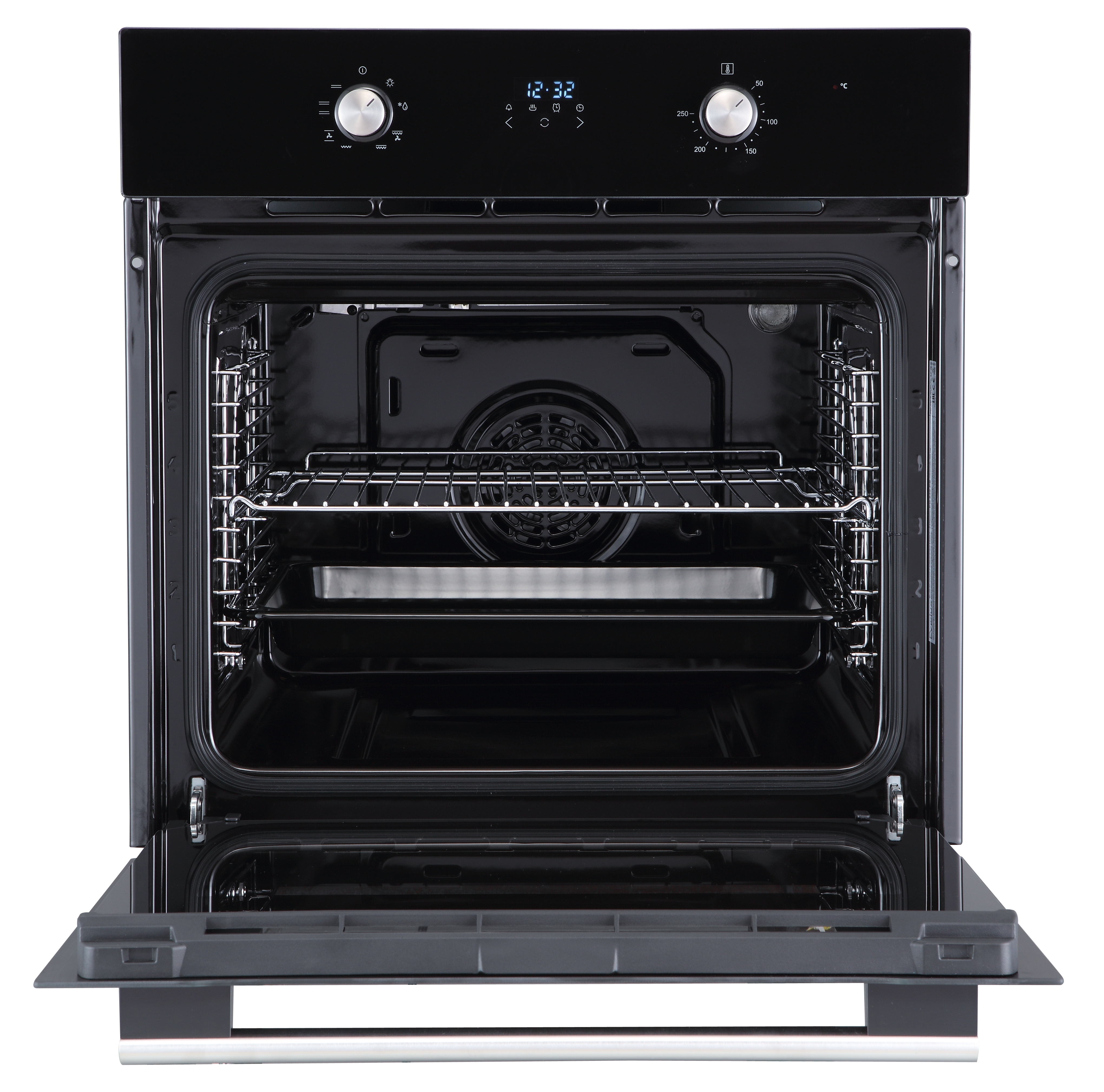 • Конвекционный вентилятор равномерно распределяет температуру в камере духовки, поэтому можно готовить несколько блюд одновременно, например, запекать курицу и выпекать пирог.