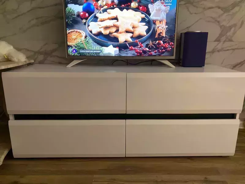 Тумба оборудована четырьмя выдвижными ящиками на шариковых направляющих, что обеспечивает легкое открывание. Фасады открываются за край, позволяя отказаться от использования ручек.