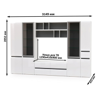 Набор мебели для гостиной Сидней № 34 состоит из тумбы для ТВ, двух навесных полок, двух шкафов-витрин, шкафа с глухими фасадами и шкафа с дверками и ящиком. Тумба под ТВ Сидней 13.63 оборудована четырьмя выдвижными ящиками на шариковых направляющих, что обеспечивает легкое открывание. Шкаф Сидней 13.200 конструктивно разделён на два отделения за распашными дверками - верхнее и нижнее. За распашной дверкой верхнего отделения располагаются три полки, за дверкой нижнего - одна. Шкаф Сидней 13.202 состоит из верхнего и нижнего отделений с полками за дверками и выдвижным ящиком по центру. В верхнем отделении три полки, в нижнем 1 полочка. Шкаф-витрина Сидней 13.201, в комплектации 2 единицы, конструктивно разделён на два отделения за распашными дверками - верхнее и нижнее. Верхнее отделение со стеклянной дверкой, за которой располагаются три стеклянные полки. За глухой дверкой нижнего отделения имеется одна полочка. Сторону открывания дверей обоих шкафов, Вы определяете при сборке. Навесная полка Сидней 15.57, в комплектации 2 единицы, представляет из себя широкую нишу, разделенную на 3 ассиметричных отделения. Задняя стенка полки чёрного цвета эффектно подчеркивает наполнение полки. Полка имеет универсальную сборку - разделители внутри полки можно установить как слева, так и справа. Лаконичные белые глянцевые фасады из МДФ 16 мм создают ощущение чистоты и свежести, лёгкости, свободного пространства. Акцентом выступают чёрные горизонтальные вставки между фасадами. Фасады могут открываться за край, либо нажатием, с помощью механизма Push-to-Open, позволяющий отказаться от использования ручек. Распашные фасады оснащены доводчиками, что обеспечивает плавное закрывание и исключает удар о корпус. Мебель выполнена из прочной ламинированной ДСП 16 мм, торцы деталей закромлены плёнкой ПВХ 0,4-2 мм. Фасады выполнены из МДФ 16 мм белый глянец и тонированного стекла. Изображения набора Вы можете найти выше в начале страницы. Коллекция Сидней - современный дизайн, технологичноть и надежность.