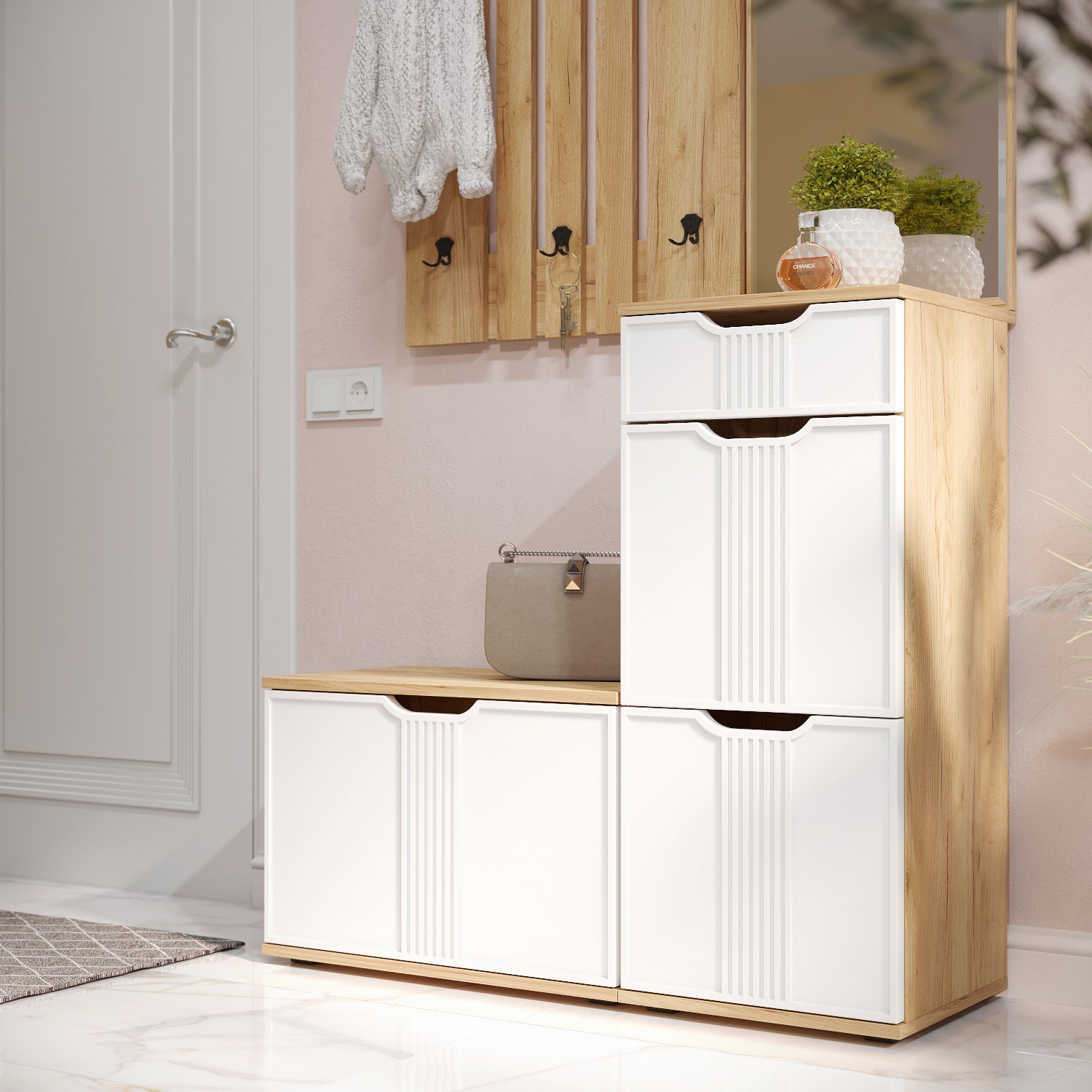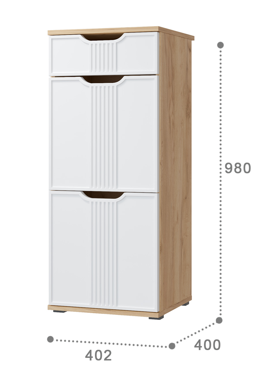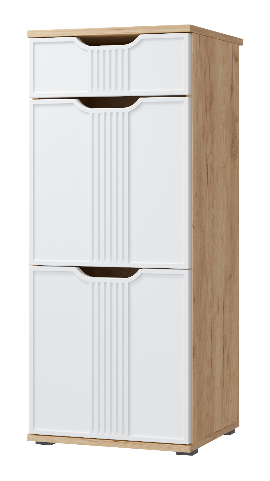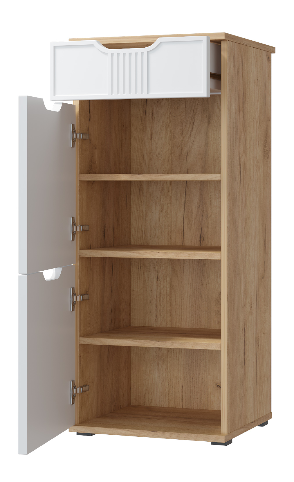 Тумба Эмилия ЭЛ-3 изготовлена из ЛДСП 16 мм, фасады МДФ. Тумба оснащена одним выдвижным ящиком, за дверьми расположены три полки для размещения обуви и других вещей. Сочетая тумбу с другими модулями из коллекции Эмилия, Вы можете создать стильную и лаконичную прихожую у себя дома. Фурнитура: телескопические направляющие полного выдвижения, петли с доводчиками.