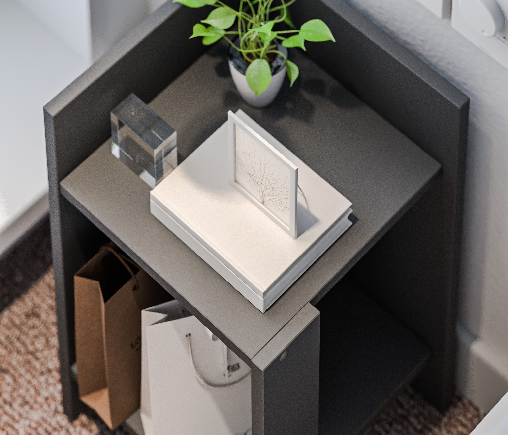 При компактных габаритных размерах – ширина 30см, высота 50,4 см и глубина 29,6 см, тумба довольно вместительная: на имеющихся полочках можно разместить книги, аксессуары и предметы декора. Тумбу можно использовать и как придиванный столик, за которым можно перекусить или выпить чашечку чая.