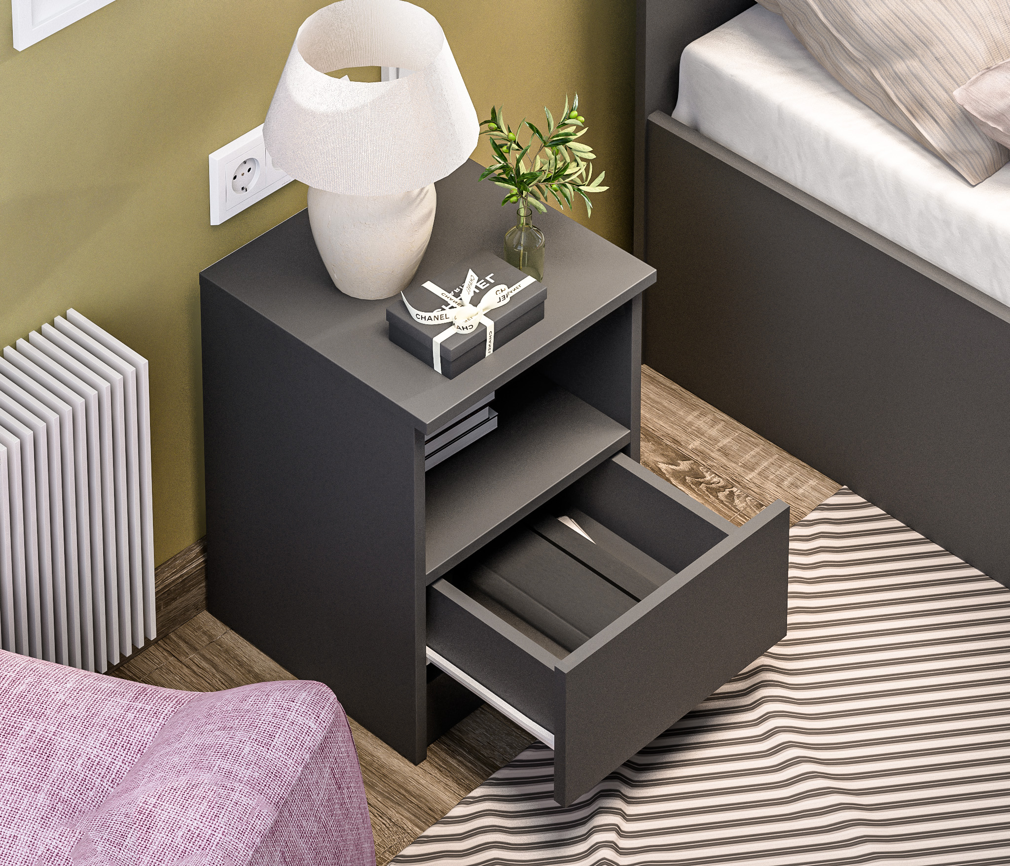 При компактных габаритных размерах – ширина 35 см, высота 44,4см и глубина 35,3 см, тумба довольно вместительная. Под столешницей расположены открытая полка и выдвижной ящик, куда можно положить планшет или книгу.