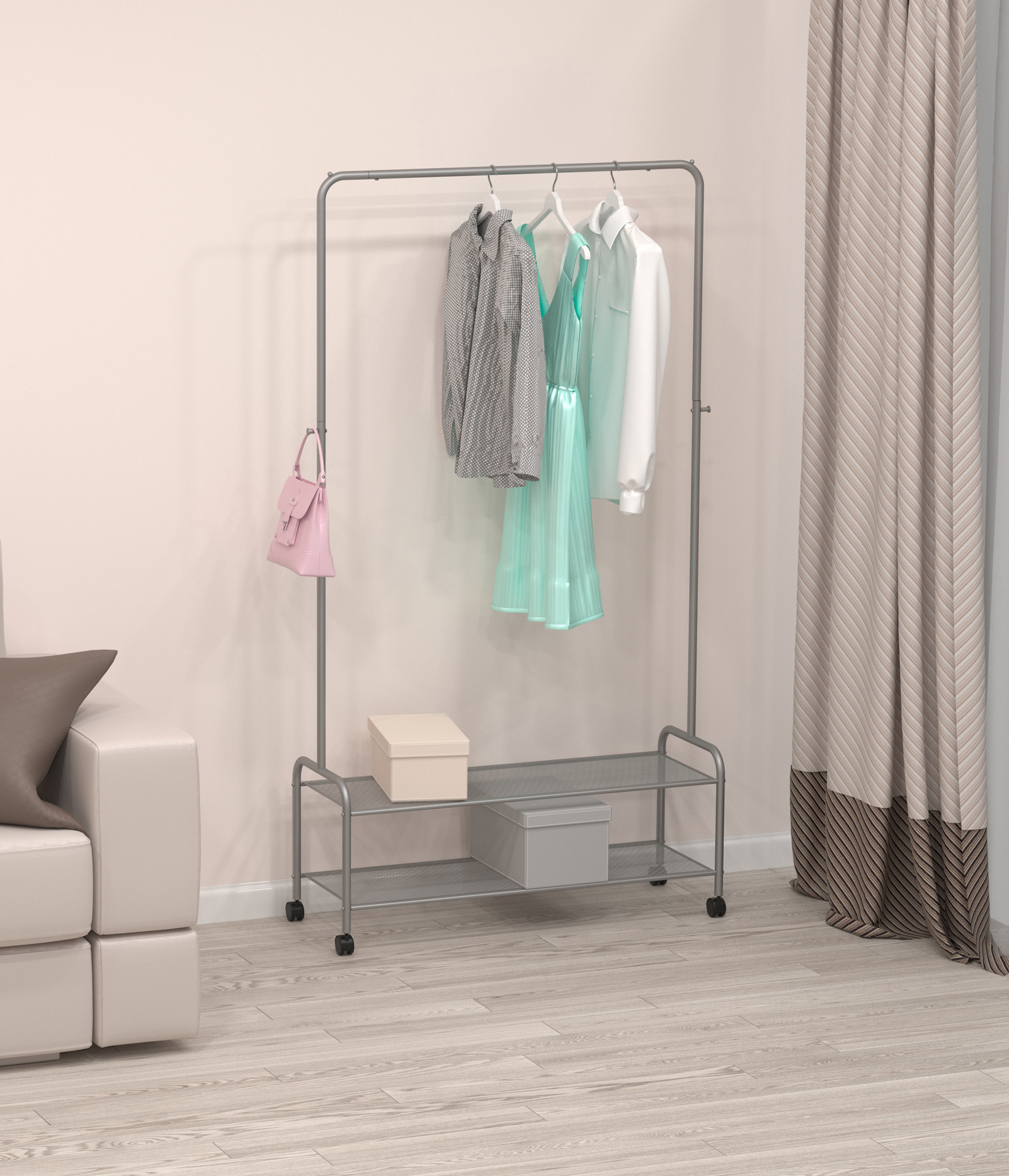 Стильная гардеробная вешалка "Валенсия 32М" от российского производителя "ЗМИ" создана для хранения одежды и обуви. Благодаря своему дизайну, многофункциональности отлично впишется в любой интерьер. Её можно использовать в гардеробе, спальне или прихожей. Долговечная, благодаря корпусу из стали покрытому полимерно-порошковым покрытием. Вмещает порядка 15 плечиков, а ограничители не дадут им соскользнуть на пол. Перекладина выдерживает нагрузку до 20 кг. На двух сетчатых полках с лёгкостью помещается до 8 пар обуви. С помощью колёсиков вешалку удобно перемещать по комнате. На боковых стойках предусмотрены стильные металлические крючки для хранения сумок и прочих предметов. Изделие в цветной картонной упаковке с удобной ручкой.