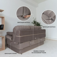 Наполнение верхнего матраса и декоративных подушек состоит из смеси крошки поролона с синтепухом, что не дает быструю усадку изделию и поддерживает его форму долгое время.