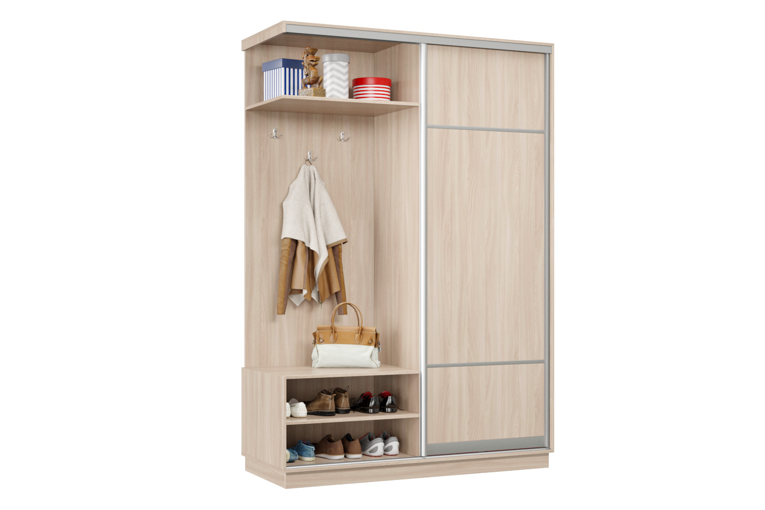 В прихожей используется одна дверь, которая перемещается по однополосному треку вправо или влево, закрывая или открывая каждую из двух частей шкафа.