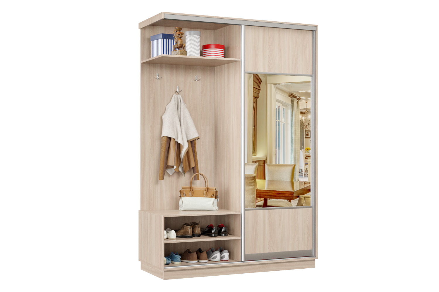 Дверь делит шкаф на 2 равные части: отделение для верхней одежды и отделение с полками и крючками.