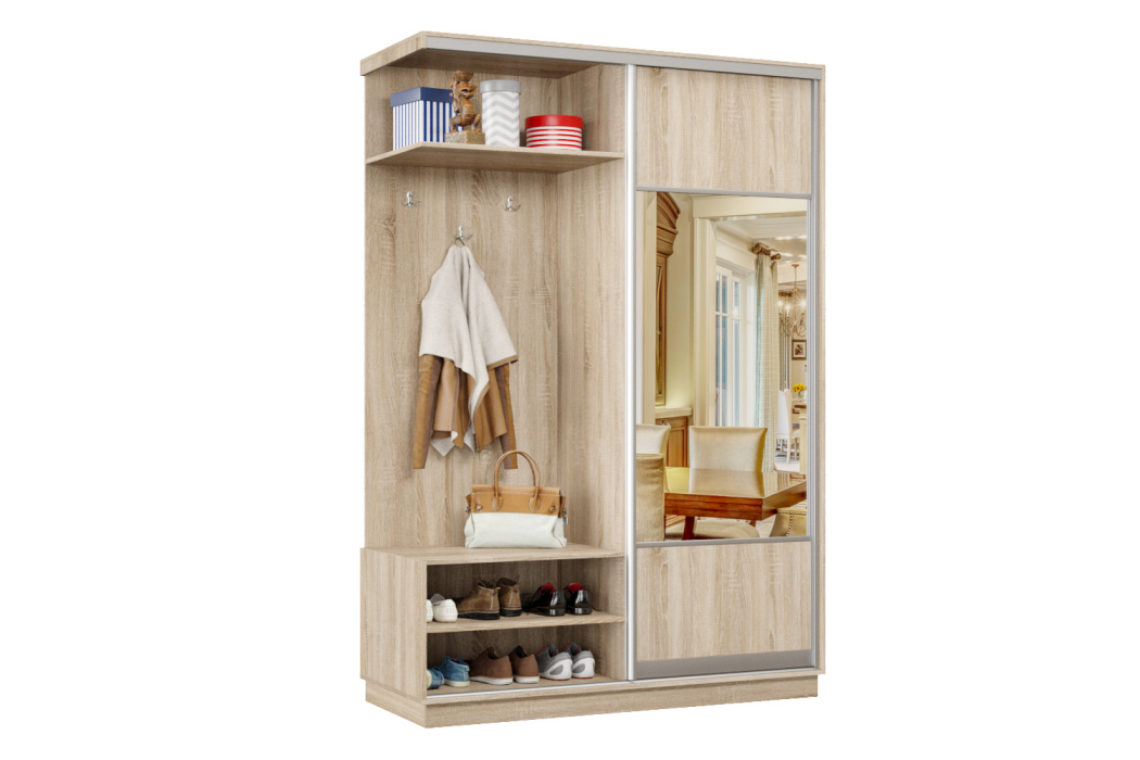 В прихожей используется одна дверь, которая перемещается по однополосному треку вправо или влево, закрывая или открывая каждую из двух частей шкафа.