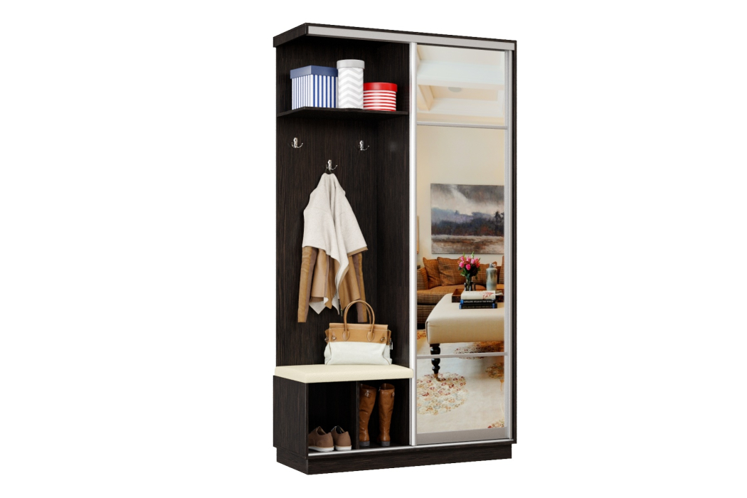 В прихожей используется одна дверь, которая перемещается по однополосному треку вправо или влево, закрывая или открывая каждую из двух частей шкафа.
