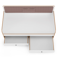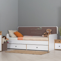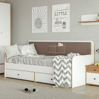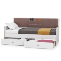 Прелестная кровать с ящиками выполнена в виде удобного диванчика - мягкая задняя спинка, скругленные подлокотники из ЛДСП. Спальное место - 900х2000 мм. Основание под матрас (настил ЛДСП 16 мм.) в комплекте. Матрас 900х2000 мм. для кровати приобретается отдельно. Рекомендуемая максимальная высота матраса - 200 мм. Задняя стенка кровати с ящиками Вуди 11.02 изготовлена из практичной, модной ткани - рогожка Savana Latte и декорировано удобными карманчиками для аксессуаров. В основании кровати оборудованы два выдвижных ящика для постельных принадлежностей и личных вещей ребёнка. Ящики достаточно вместительные и установлены на колесные опоры, что обеспечивает им легкое выдвижение. Изображения кровати с ящиками Вуди 11.02 Вы можете найти выше в начале страницы. Кровать с ящиками Вуди 11.02 - элемент из набора мебели для молодежной комнаты Вуди.