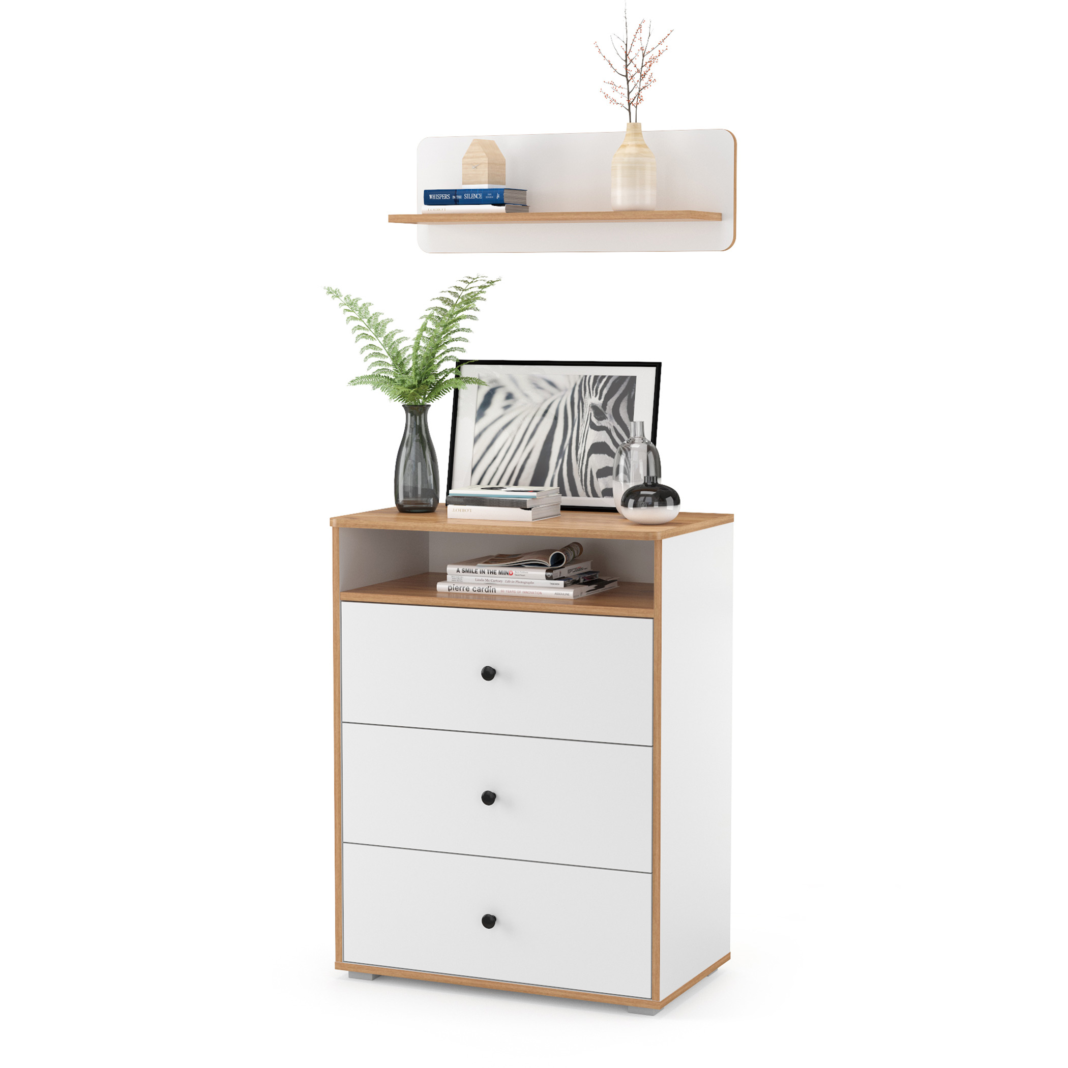 Комплект состоит из комода Вуди 13.293 и полки навесной Вуди 15.46. Комод имеет верхнюю открытую нишу и три выдвижных ящика для одежды, вещей, игрушек, документов и всего, что Вы захотите хранить в комоде. Открытая навесная полочка с задней панелью в светлых тонах и плавными изгибами станет украшением стены. Разместить на этой полочке можно не только фотографии любимых, а также книги и элементы декора. Корпуса и фасады мебели изготовлены из экологически чистой ламинированной ДСП 16 мм., торцы окромлены ПХВ плёнкой 0,4 мм. Лицевая фурнитура выполнена из черного пластика. Выдвижные ящики на шариковых направляющих полного выдвижения обеспечивают длительную и тихую эксплуатацию. Поставляется молодёжный комод Вуди с открытой полкой в разобранном виде, надёжно упакованной в гофрокартон, с приложенной подробной инструкцией по сборке. Вы можете купить молодёжный комод Вуди с открытой полкой со скидкой при заказе через сайт в нашем магазине. Изображения молодёжного комода Вуди с открытой полкой Вы можете найти выше в начале страницы. Молодёжный комод Вуди с открытой полкой - элементы из набора мебели для молодежной комнаты Вуди.