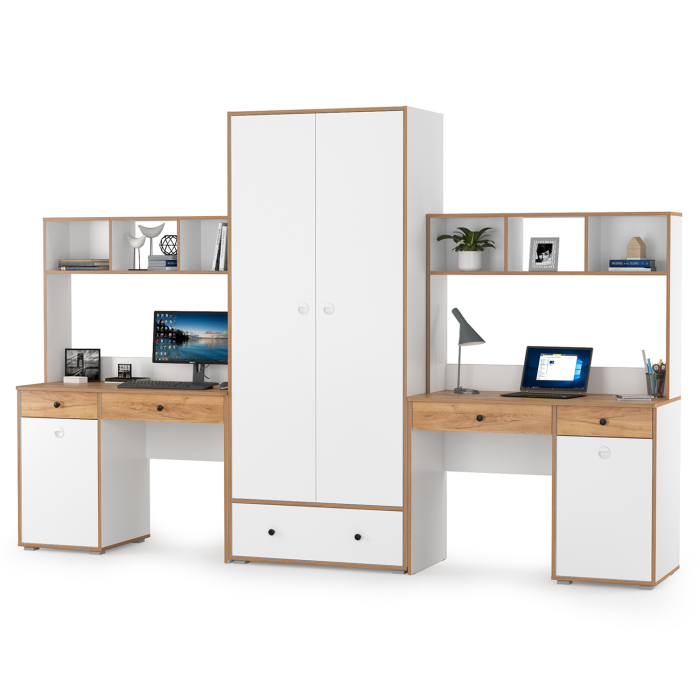 Два компьютерных стола и платяной шкаф Вуди - прямые линии и простые формы без явного декора. Габариты (ШхГхВ) 306х52,7х205 см.