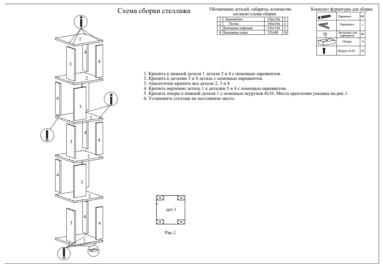 Стеллаж СВК визуально максимально легкий с прекрасным доступом к каждой полечке, идеально подойдет и для книг и журналов и как стенд для поделок Вашего ребенка. Конструктивно представляет из себя 5 ярусов с четырьмя полочками с доступом с четырех сторон. Стеллаж СВК установлен на пластиковые опоры высотой 20 мм., защищающие покрытие пола от повреждений. Выполнен стеллаж СВК из прочной ламинированной ДСП 16 мм, торцы деталей закромлены плёнкой ПВХ 0,4-2 мм. Поставляется стеллаж СВК в разобранном виде, надёжно упакованной в гофрокартон, с приложенной подробной инструкцией по сборке. Изображения стеллажа СВК Вы можете найти выше в начале страницы.