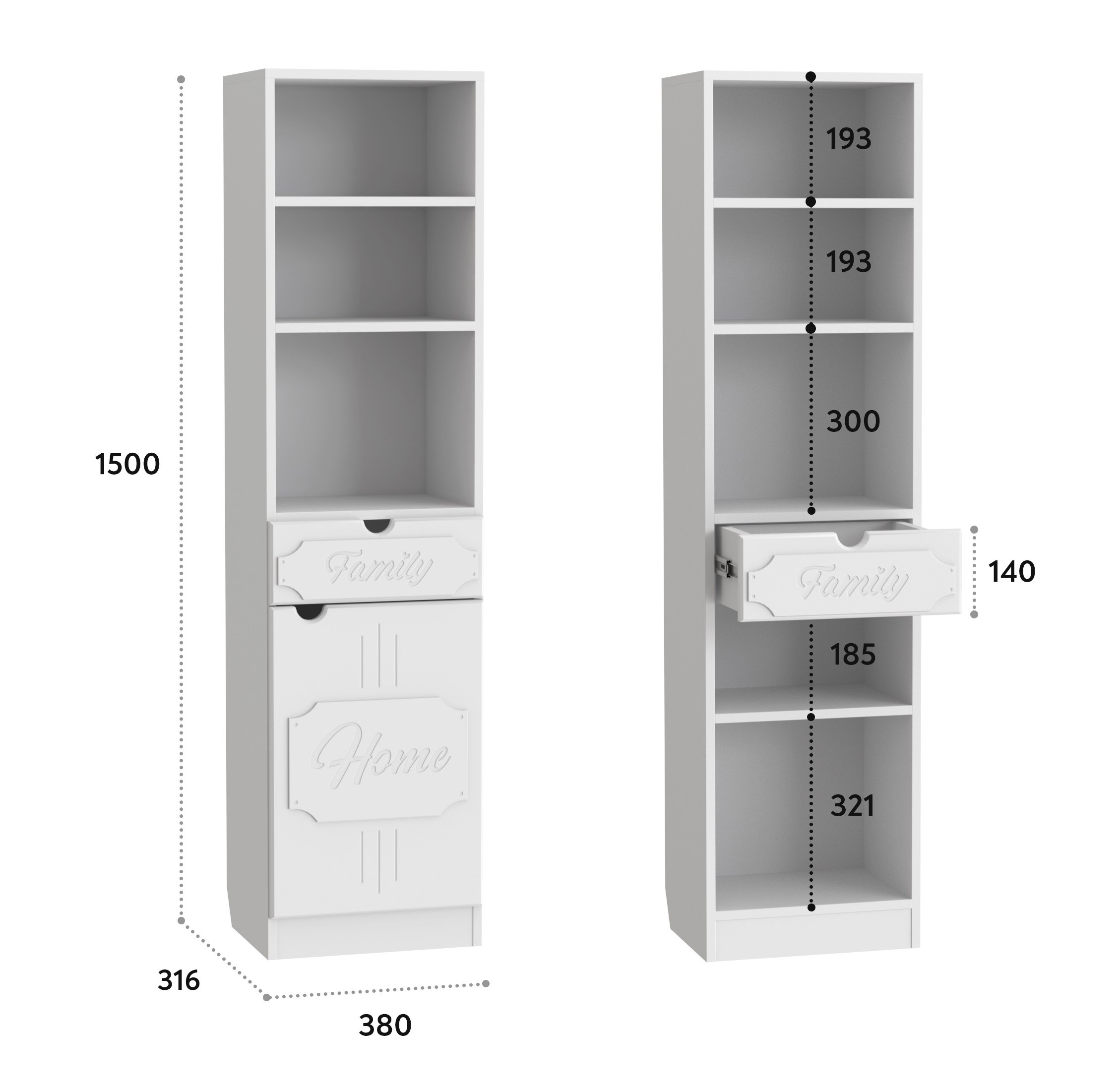 Пенал ДримСтар ДС-62 станет прекрасным дополнением вашей гостиной, спальни или детской комнаты. Пенал имеет три отделения, верхнее отделение с двумя открытыми полками, нижнее отделение с дверью и полкой, посередине выдвижной ящик. Фурнитура: петли с доводчиками, телескопические направляющие полного выдвижения.