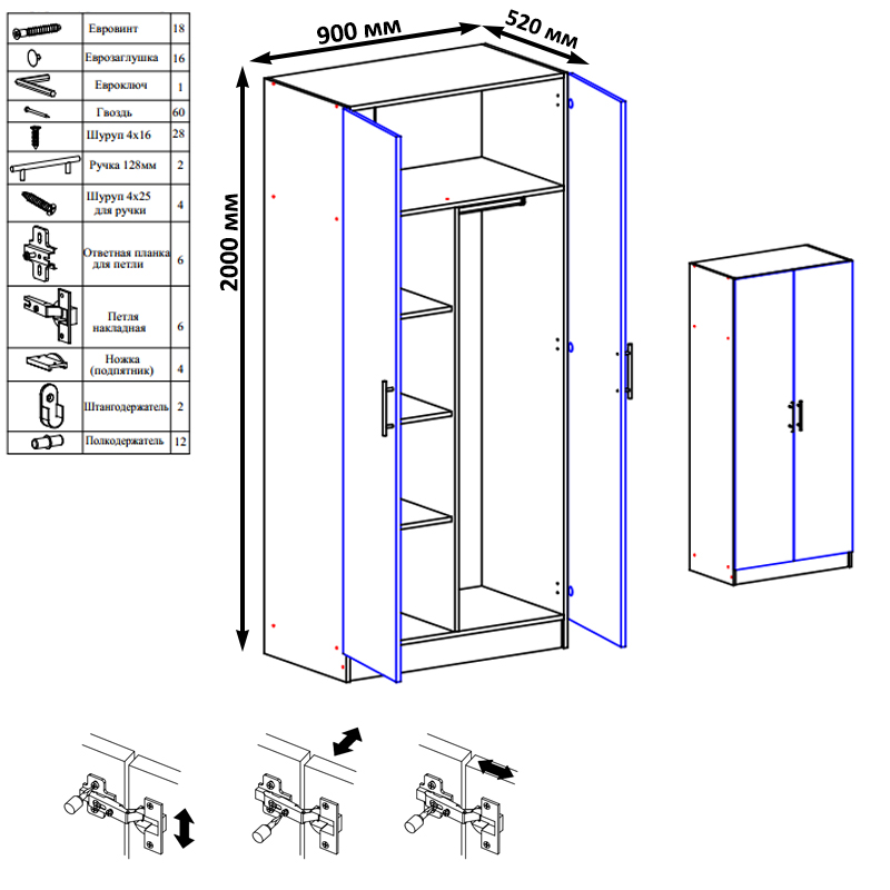 Габаритные размеры шкафа (ШхГхВ): 90х52х200 см.