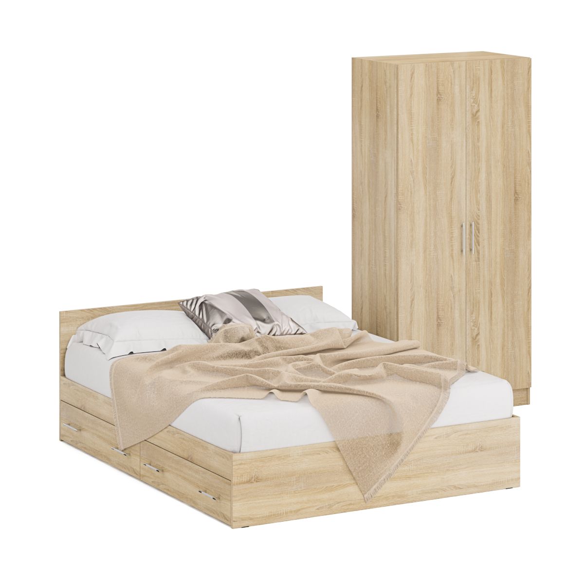 Комплект состоит из двуспальной кровати с ящиками и шкафа 2-х створчатого. Функциональность, компактность и простота формы - три слагаемые дизайнерской идеи кровати Стандарт. Классическая геометрия и спокойный природный тон кровати поддержат базовый интерьер, легко сочетаясь с мебелью любого стиля. В комнату с такой нейтральной обстановкой легко добавить индивидуальности, расставив акценты с помощью креативных аксессуаров. Кровать Стандарт - надёжная, с устойчивым основанием и удобной спинкой, идеально подходит для детской комнаты. Сп.м. 1600х2000 мм, основание в комплекте (настил ДСП), матрас 1600х2000 мм. приобретается отдельно. В основании кровати расположены два вместительных ящика для хранения постельных принадлежностей и личных вещей. Определённый интерес мебель Стандарт представляет и для обустройства гостиничных номеров, пансионатов, детских лагерей. За распашными дверками шкафа расположены отделение со штангой для одежды на плечиках и антресольной полкой с одной стороны, и нишей с тремя полками с другой. Двуспальная кровать с ящиками 1600 со шкафом для одежды 2-х створчатым Стандарт поможет создать универсальный интерьер, который будет жить вне времени и моды, без необходимости обновления. Элегантная простота и эргономичность кровати, в сочетании с идеальным качеством исполнения, обещают удовольствие на долгие годы. Двуспальная кровать с ящиками 1600 со шкафом для одежды 2-х створчатым Стандарт выполнены из экологически чистой ламинированной ДСП с классом эмиссии Е1, допустимым для детской мебели. В производстве мебели использована фурнитура высоких стандартов и обработка деталей противоударной кромкой ПХВ. Поставляется мебель в разобранном виде в надёжной упаковке, с комплектом фурнитуры и инструкцией по сборке.