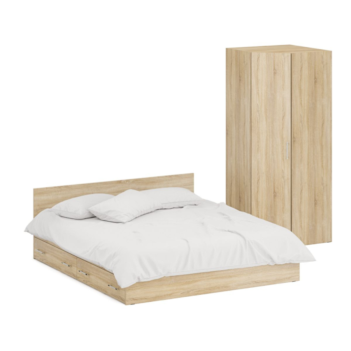 Комплект состоит из двуспальной кровати с ящиками и шкафа углового. Функциональность, компактность и простота формы - три слагаемые дизайнерской идеи кровати Стандарт. Классическая геометрия и спокойный природный тон кровати поддержат базовый интерьер, легко сочетаясь с мебелью любого стиля. В комнату с такой нейтральной обстановкой легко добавить индивидуальности, расставив акценты с помощью креативных аксессуаров. Кровать Стандарт - надёжная, с устойчивым основанием и удобной спинкой, идеально подходит для детской комнаты. Сп.м. 1800х2000 мм, основание в комплекте (настил ДСП), матрас 1800х2000 мм. приобретается отдельно. В основании кровати расположены два вместительных ящика для хранения постельных принадлежностей и личных вещей. Определённый интерес мебель Стандарт представляет и для обустройства гостиничных номеров, пансионатов, детских лагерей. За распашной дверкой шкафа углового расположены два отделения - со штангой для одежды на плечиках и антресольной полкой с одной стороны, и нишей с тремя полками с другой. Универсальная сборка - сторону открывания двери и располажение отделений внутри шкафа - Вы определятете при сборке. Боковина шкафа углового для соединения с другой мебелью имеет глубину 52 см. Двуспальная кровать с ящиками 1800 с угловым шкафом Стандарт поможет создать универсальный интерьер, который будет жить вне времени и моды, без необходимости обновления. Элегантная простота и эргономичность кровати, в сочетании с идеальным качеством исполнения, обещают удовольствие на долгие годы. Двуспальная кровать с ящиками 1800 с угловым шкафом Стандарт выполнены из экологически чистой ламинированной ДСП с классом эмиссии Е1, допустимым для детской мебели. В производстве мебели использована фурнитура высоких стандартов и обработка деталей противоударной кромкой ПХВ. Поставляется мебель в разобранном виде в надёжной упаковке, с комплектом фурнитуры и инструкцией по сборке.