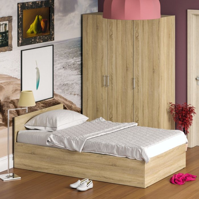 Спальный гарнитур № 1 состоит из односпальной кровати, 2-х створчатого шкафа для одежды и пенала, объединенных в единый блок. Функциональность, компактность и простота формы - три слагаемые дизайнерской идеи спален Стандарт. Классическая геометрия и спокойный природный тон мебели Стандарт поддержат базовый интерьер, легко сочетаясь с мебелью любого стиля. В комнату с такой нейтральной обстановкой легко добавить индивидуальности, расставив акценты с помощью креативных аксессуаров. Кровать Стандарт - надёжная, с устойчивым основанием и удобной спинкой, идеально подходит для детской комнаты. Сп.м. 1200х2000 мм, основание в комплекте (настил ДСП), матрас 1200х2000 мм. приобретается отдельно. Определённый интерес мебель Стандарт представляет и для обустройства гостиничных номеров, пансионатов, детских лагерей. За распашными дверками шкафа для одежды расположены отделение со штангой для одежды на плечиках и антресольной полкой с одной стороны, и нишей с тремя полками с другой. Высокий пенал, за распашной дверкой которого расположены четыре съёмные полки. Универсальная дверь - сторону открывания двери Вы определятете при сборке. Спальный гарнитур № 1 имеет универсальный интерьер, который будет жить вне времени и моды, без необходимости обновления. Элегантная простота и эргономичность кровати, в сочетании с идеальным качеством исполнения, обещают удовольствие на долгие годы. Спальный гарнитур № 1 выполнен из экологически чистой ламинированной ДСП с классом эмиссии Е1, допустимым для детской мебели. В производстве мебели использована фурнитура высоких стандартов и обработка деталей противоударной кромкой ПХВ. Поставляется мебель в разобранном виде в надёжной упаковке, с комплектом фурнитуры и инструкцией по сборке.