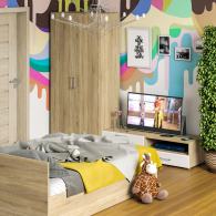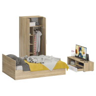 Спальня Стандарт № 3 состоит из двухспальной кровати, шкафа 2-х створчатого и тумбы под ТВ. Функциональность, компактность и простота формы - три слагаемые дизайнерской идеи спален Стандарт. Классическая геометрия и спокойный природный тон мебели Стандарт поддержат базовый интерьер, легко сочетаясь с мебелью любого стиля. В комнату с такой нейтральной обстановкой легко добавить индивидуальности, расставив акценты с помощью креативных аксессуаров. Кровать Стандарт - надёжная, с устойчивым основанием и удобной спинкой, идеально подходит для детской комнаты. Сп.м. 1400х2000 мм, основание в комплекте (настил ДСП), матрас 1400х2000 мм. приобретается отдельно. Определённый интерес мебель Стандарт представляет и для обустройства гостиничных номеров, пансионатов, детских лагерей. За распашными дверками шкафа для одежды расположены отделение со штангой для одежды на плечиках и антресольной полкой с одной стороны, и нишей с тремя полками с другой. Тумба под ТВ придётся по вкусу любителям стильных элементов мебели в оформлении интерьера. Особый акцент данной модели - глянцевое покрытие фасадов, выполненных из МДФ 16 мм. с торцевой фрезеровкой в виде фацета и геометрической фрезеровкой откидной дверки. Линейный декор тумбы подчёркнут ручками-рейлингами, имеющих сочетанное хромированно-матовое покрытие. Конструктивно тумба разделена на два одинаковой ширины отделения. Слева расположена закрытая откидной дверкой ниша, справа - открытая ниша и выдвижной ящик. Установлена тумба на плоские, прочные и надёжные прямоугольные ножки. Пластиковые накладки на ножках защитят Ваше напольное покрытие от механических повреждений. Спальня Стандарт № 3 имеет универсальный интерьер, который будет жить вне времени и моды, без необходимости обновления. Элегантная простота и эргономичность кровати, в сочетании с идеальным качеством исполнения, обещают удовольствие на долгие годы. Спальня Стандарт № 3 выполнен из экологически чистой ламинированной ДСП с классом эмиссии Е1, допустимым для детской мебели. В производстве мебели использована фурнитура высоких стандартов и обработка деталей противоударной кромкой ПХВ. Поставляется мебель в разобранном виде в надёжной упаковке, с комплектом фурнитуры и инструкцией по сборке.