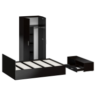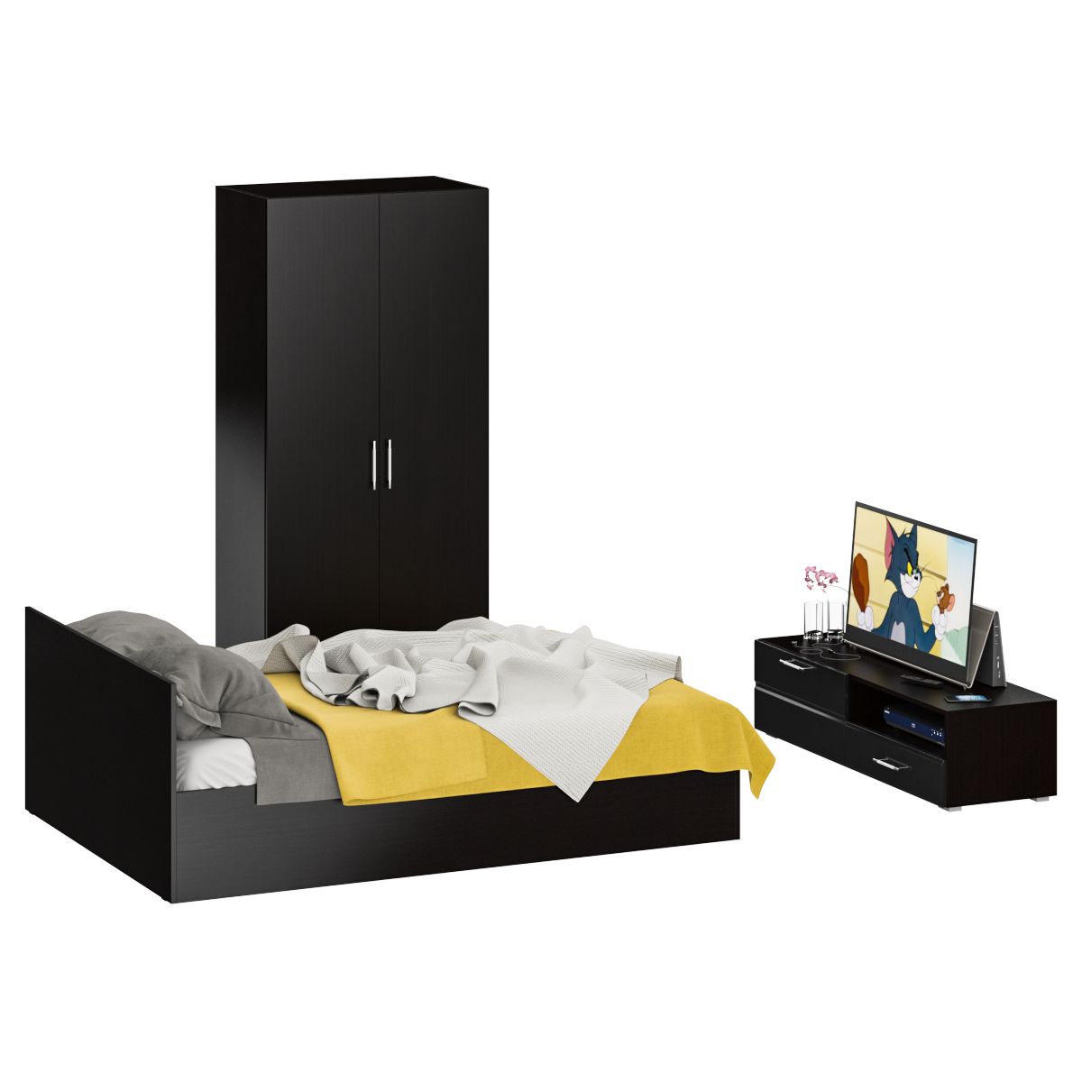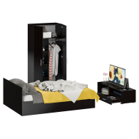 Спальня Стандарт № 3 состоит из двухспальной кровати, шкафа 2-х створчатого и тумбы под ТВ. Функциональность, компактность и простота формы - три слагаемые дизайнерской идеи спален Стандарт. Классическая геометрия и спокойный природный тон мебели Стандарт поддержат базовый интерьер, легко сочетаясь с мебелью любого стиля. В комнату с такой нейтральной обстановкой легко добавить индивидуальности, расставив акценты с помощью креативных аксессуаров. Кровать Стандарт - надёжная, с устойчивым основанием и удобной спинкой, идеально подходит для детской комнаты. Сп.м. 1400х2000 мм, основание в комплекте (настил ДСП), матрас 1400х2000 мм. приобретается отдельно. Определённый интерес мебель Стандарт представляет и для обустройства гостиничных номеров, пансионатов, детских лагерей. За распашными дверками шкафа для одежды расположены отделение со штангой для одежды на плечиках и антресольной полкой с одной стороны, и нишей с тремя полками с другой. Тумба под ТВ придётся по вкусу любителям стильных элементов мебели в оформлении интерьера. Особый акцент данной модели - глянцевое покрытие фасадов, выполненных из МДФ 16 мм. с торцевой фрезеровкой в виде фацета и геометрической фрезеровкой откидной дверки. Линейный декор тумбы подчёркнут ручками-рейлингами, имеющих сочетанное хромированно-матовое покрытие. Конструктивно тумба разделена на два одинаковой ширины отделения. Слева расположена закрытая откидной дверкой ниша, справа - открытая ниша и выдвижной ящик. Установлена тумба на плоские, прочные и надёжные прямоугольные ножки. Пластиковые накладки на ножках защитят Ваше напольное покрытие от механических повреждений. Спальня Стандарт № 3 имеет универсальный интерьер, который будет жить вне времени и моды, без необходимости обновления. Элегантная простота и эргономичность кровати, в сочетании с идеальным качеством исполнения, обещают удовольствие на долгие годы. Спальня Стандарт № 3 выполнен из экологически чистой ламинированной ДСП с классом эмиссии Е1, допустимым для детской мебели. В производстве мебели использована фурнитура высоких стандартов и обработка деталей противоударной кромкой ПХВ. Поставляется мебель в разобранном виде в надёжной упаковке, с комплектом фурнитуры и инструкцией по сборке.