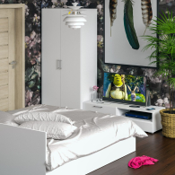 Спальня Стандарт № 3 состоит из двухспальной кровати, шкафа 2-х створчатого и тумбы под ТВ. Функциональность, компактность и простота формы - три слагаемые дизайнерской идеи спален Стандарт. Классическая геометрия и спокойный природный тон мебели Стандарт поддержат базовый интерьер, легко сочетаясь с мебелью любого стиля. В комнату с такой нейтральной обстановкой легко добавить индивидуальности, расставив акценты с помощью креативных аксессуаров. Кровать Стандарт - надёжная, с устойчивым основанием и удобной спинкой, идеально подходит для детской комнаты. Сп.м. 1800х2000 мм, основание в комплекте (настил ДСП), матрас 1800х2000 мм. приобретается отдельно. Определённый интерес мебель Стандарт представляет и для обустройства гостиничных номеров, пансионатов, детских лагерей. За распашными дверками шкафа для одежды расположены отделение со штангой для одежды на плечиках и антресольной полкой с одной стороны, и нишей с тремя полками с другой. Тумба под ТВ придётся по вкусу любителям стильных элементов мебели в оформлении интерьера. Особый акцент данной модели - глянцевое покрытие фасадов, выполненных из МДФ 16 мм. с торцевой фрезеровкой в виде фацета и геометрической фрезеровкой откидной дверки. Линейный декор тумбы подчёркнут ручками-рейлингами, имеющих сочетанное хромированно-матовое покрытие. Конструктивно тумба разделена на два одинаковой ширины отделения. Слева расположена закрытая откидной дверкой ниша, справа - открытая ниша и выдвижной ящик. Установлена тумба на плоские, прочные и надёжные прямоугольные ножки. Пластиковые накладки на ножках защитят Ваше напольное покрытие от механических повреждений. Спальня Стандарт № 3 имеет универсальный интерьер, который будет жить вне времени и моды, без необходимости обновления. Элегантная простота и эргономичность кровати, в сочетании с идеальным качеством исполнения, обещают удовольствие на долгие годы. Спальня Стандарт № 3 выполнен из экологически чистой ламинированной ДСП с классом эмиссии Е1, допустимым для детской мебели. В производстве мебели использована фурнитура высоких стандартов и обработка деталей противоударной кромкой ПХВ. Поставляется мебель в разобранном виде в надёжной упаковке, с комплектом фурнитуры и инструкцией по сборке.