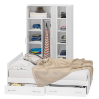 Спальный гарнитур № 1 состоит из двухспальной кровати с ящиками, 2-х створчатого шкафа для одежды и пенала, объединенных в единый блок. Функциональность, компактность и простота формы - три слагаемые дизайнерской идеи спален Стандарт. Классическая геометрия и спокойный природный тон мебели Стандарт поддержат базовый интерьер, легко сочетаясь с мебелью любого стиля. В комнату с такой нейтральной обстановкой легко добавить индивидуальности, расставив акценты с помощью креативных аксессуаров. Кровать Стандарт - надёжная, с устойчивым основанием и удобной спинкой, идеально подходит для детской комнаты. Сп.м. 1600х2000 мм, основание в комплекте (настил ДСП), матрас 1600х2000 мм. приобретается отдельно. В основании кровати расположены два вместительных ящика для хранения постельных принадлежностей и личных вещей. Определённый интерес мебель Стандарт представляет и для обустройства гостиничных номеров, пансионатов, детских лагерей. За распашными дверками шкафа для одежды расположены отделение со штангой для одежды на плечиках и антресольной полкой с одной стороны, и нишей с тремя полками с другой. Высокий пенал, за распашной дверкой которого расположены четыре съёмные полки. Универсальная дверь - сторону открывания двери Вы определятете при сборке. Спальный гарнитур № 1 имеет универсальный интерьер, который будет жить вне времени и моды, без необходимости обновления. Элегантная простота и эргономичность кровати, в сочетании с идеальным качеством исполнения, обещают удовольствие на долгие годы. Спальный гарнитур № 1 выполнен из экологически чистой ламинированной ДСП с классом эмиссии Е1, допустимым для детской мебели. В производстве мебели использована фурнитура высоких стандартов и обработка деталей противоударной кромкой ПХВ. Поставляется мебель в разобранном виде в надёжной упаковке, с комплектом фурнитуры и инструкцией по сборке.