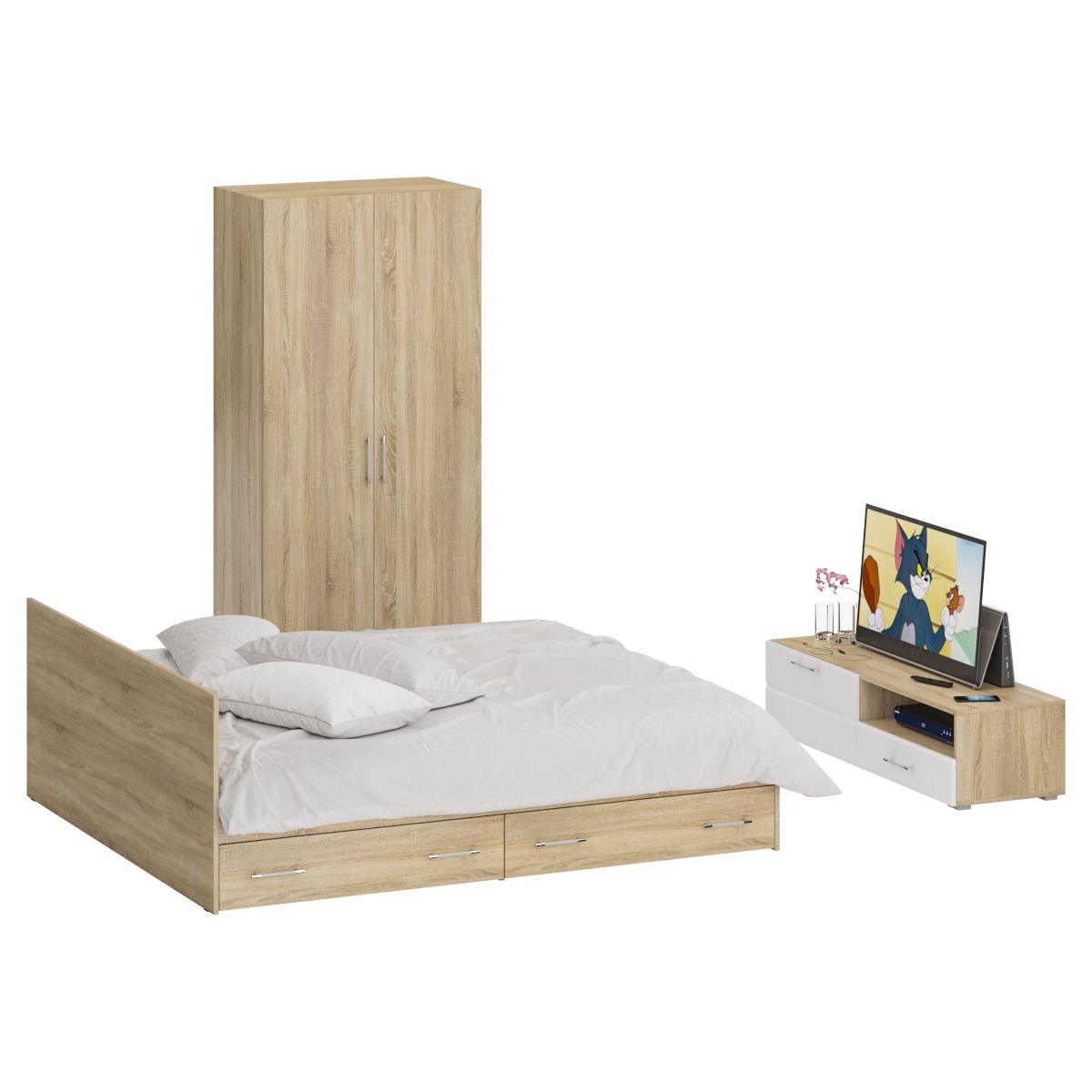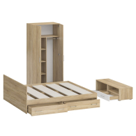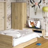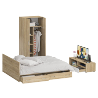 Спальня Стандарт № 3 состоит из двухспальной кровати, шкафа 2-х створчатого и тумбы под ТВ. Функциональность, компактность и простота формы - три слагаемые дизайнерской идеи спален Стандарт. Классическая геометрия и спокойный природный тон мебели Стандарт поддержат базовый интерьер, легко сочетаясь с мебелью любого стиля. В комнату с такой нейтральной обстановкой легко добавить индивидуальности, расставив акценты с помощью креативных аксессуаров. Кровать Стандарт - надёжная, с устойчивым основанием и удобной спинкой, идеально подходит для детской комнаты. Сп.м. 1800х2000 мм, основание в комплекте (настил ДСП), матрас 1800х2000 мм. приобретается отдельно. В основании кровати расположены два вместительных ящика для хранения постельных принадлежностей и личных вещей. Определённый интерес мебель Стандарт представляет и для обустройства гостиничных номеров, пансионатов, детских лагерей. За распашными дверками шкафа для одежды расположены отделение со штангой для одежды на плечиках и антресольной полкой с одной стороны, и нишей с тремя полками с другой. Тумба под ТВ придётся по вкусу любителям стильных элементов мебели в оформлении интерьера. Особый акцент данной модели - глянцевое покрытие фасадов, выполненных из МДФ 16 мм. с торцевой фрезеровкой в виде фацета и геометрической фрезеровкой откидной дверки. Линейный декор тумбы подчёркнут ручками-рейлингами, имеющих сочетанное хромированно-матовое покрытие. Конструктивно тумба разделена на два одинаковой ширины отделения. Слева расположена закрытая откидной дверкой ниша, справа - открытая ниша и выдвижной ящик. Установлена тумба на плоские, прочные и надёжные прямоугольные ножки. Пластиковые накладки на ножках защитят Ваше напольное покрытие от механических повреждений. Спальня Стандарт № 3 имеет универсальный интерьер, который будет жить вне времени и моды, без необходимости обновления. Элегантная простота и эргономичность кровати, в сочетании с идеальным качеством исполнения, обещают удовольствие на долгие годы. Спальня Стандарт № 3 выполнен из экологически чистой ламинированной ДСП с классом эмиссии Е1, допустимым для детской мебели. В производстве мебели использована фурнитура высоких стандартов и обработка деталей противоударной кромкой ПХВ. Поставляется мебель в разобранном виде в надёжной упаковке, с комплектом фурнитуры и инструкцией по сборке.