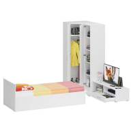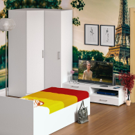 Мебель для спальни Стандарт № 4 состоит из односпальной кровати, объединенных в единый блок углового шкафа и пенала, и тумбы под ТВ. Функциональность, компактность и простота формы - три слагаемые дизайнерской идеи спален Стандарт. Классическая геометрия и спокойный природный тон мебели Стандарт поддержат базовый интерьер, легко сочетаясь с мебелью любого стиля. В комнату с такой нейтральной обстановкой легко добавить индивидуальности, расставив акценты с помощью креативных аксессуаров. Кровать Стандарт - надёжная, с устойчивым основанием и удобной спинкой, идеально подходит для детской комнаты. Сп.м. 900х2000 мм, основание в комплекте (настил ДСП), матрас 900х2000 мм. приобретается отдельно. Определённый интерес мебель Стандарт представляет и для обустройства гостиничных номеров, пансионатов, детских лагерей. Гардеробный блок представлен угловым шкафом и пеналом. За распашной дверкой шкафа углового расположены два отделения - со штангой для одежды на плечиках и антресольной полкой с одной стороны, и нишей с тремя полками с другой. Универсальная сборка - сторону открывания двери и располажение отделений внутри шкафа - Вы определятете при сборке. Боковина шкафа углового для соединения с другой мебелью имеет глубину 52 см. Высокий пенал, за распашной дверкой которого расположены четыре съёмные полки. Универсальная дверь - сторону открывания двери Вы определятете при сборке. Тумба под ТВ придётся по вкусу любителям стильных элементов мебели в оформлении интерьера. Особый акцент данной модели - глянцевое покрытие фасадов, выполненных из МДФ 16 мм. с торцевой фрезеровкой в виде фацета и геометрической фрезеровкой откидной дверки. Линейный декор тумбы подчёркнут ручками-рейлингами, имеющих сочетанное хромированно-матовое покрытие. Конструктивно тумба разделена на два одинаковой ширины отделения. Слева расположена закрытая откидной дверкой ниша, справа - открытая ниша и выдвижной ящик. Установлена тумба на плоские, прочные и надёжные прямоугольные ножки. Пластиковые накладки на ножках защитят Ваше напольное покрытие от механических повреждений. Мебель для спальни Стандарт № 4 имеет универсальный интерьер, который будет жить вне времени и моды, без необходимости обновления. Элегантная простота и эргономичность кровати, в сочетании с идеальным качеством исполнения, обещают удовольствие на долгие годы. Мебель для спальни Стандарт № 4 выполнена из экологически чистой ламинированной ДСП с классом эмиссии Е1, допустимым для детской мебели. В производстве мебели использована фурнитура высоких стандартов и обработка деталей противоударной кромкой ПХВ. Поставляется мебель в разобранном виде в надёжной упаковке, с комплектом фурнитуры и инструкцией по сборке.