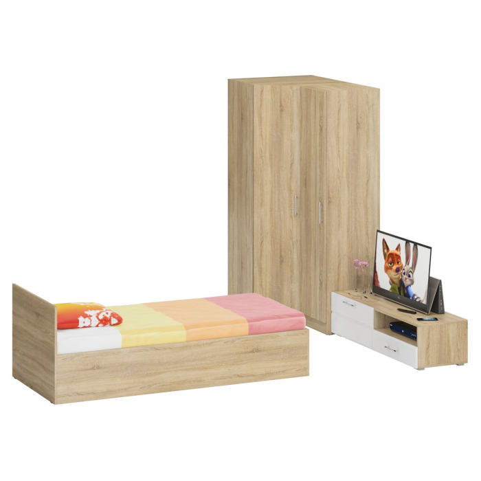 Мебель для спальни Стандарт № 4 состоит из односпальной кровати, объединенных в единый блок углового шкафа и пенала, и тумбы под ТВ. Функциональность, компактность и простота формы - три слагаемые дизайнерской идеи спален Стандарт. Классическая геометрия и спокойный природный тон мебели Стандарт поддержат базовый интерьер, легко сочетаясь с мебелью любого стиля. В комнату с такой нейтральной обстановкой легко добавить индивидуальности, расставив акценты с помощью креативных аксессуаров. Кровать Стандарт - надёжная, с устойчивым основанием и удобной спинкой, идеально подходит для детской комнаты. Сп.м. 900х2000 мм, основание в комплекте (настил ДСП), матрас 900х2000 мм. приобретается отдельно. Определённый интерес мебель Стандарт представляет и для обустройства гостиничных номеров, пансионатов, детских лагерей. Гардеробный блок представлен угловым шкафом и пеналом. За распашной дверкой шкафа углового расположены два отделения - со штангой для одежды на плечиках и антресольной полкой с одной стороны, и нишей с тремя полками с другой. Универсальная сборка - сторону открывания двери и располажение отделений внутри шкафа - Вы определятете при сборке. Боковина шкафа углового для соединения с другой мебелью имеет глубину 52 см. Высокий пенал, за распашной дверкой которого расположены четыре съёмные полки. Универсальная дверь - сторону открывания двери Вы определятете при сборке. Тумба под ТВ придётся по вкусу любителям стильных элементов мебели в оформлении интерьера. Особый акцент данной модели - глянцевое покрытие фасадов, выполненных из МДФ 16 мм. с торцевой фрезеровкой в виде фацета и геометрической фрезеровкой откидной дверки. Линейный декор тумбы подчёркнут ручками-рейлингами, имеющих сочетанное хромированно-матовое покрытие. Конструктивно тумба разделена на два одинаковой ширины отделения. Слева расположена закрытая откидной дверкой ниша, справа - открытая ниша и выдвижной ящик. Установлена тумба на плоские, прочные и надёжные прямоугольные ножки. Пластиковые накладки на ножках защитят Ваше напольное покрытие от механических повреждений. Мебель для спальни Стандарт № 4 имеет универсальный интерьер, который будет жить вне времени и моды, без необходимости обновления. Элегантная простота и эргономичность кровати, в сочетании с идеальным качеством исполнения, обещают удовольствие на долгие годы. Мебель для спальни Стандарт № 4 выполнена из экологически чистой ламинированной ДСП с классом эмиссии Е1, допустимым для детской мебели. В производстве мебели использована фурнитура высоких стандартов и обработка деталей противоударной кромкой ПХВ. Поставляется мебель в разобранном виде в надёжной упаковке, с комплектом фурнитуры и инструкцией по сборке.