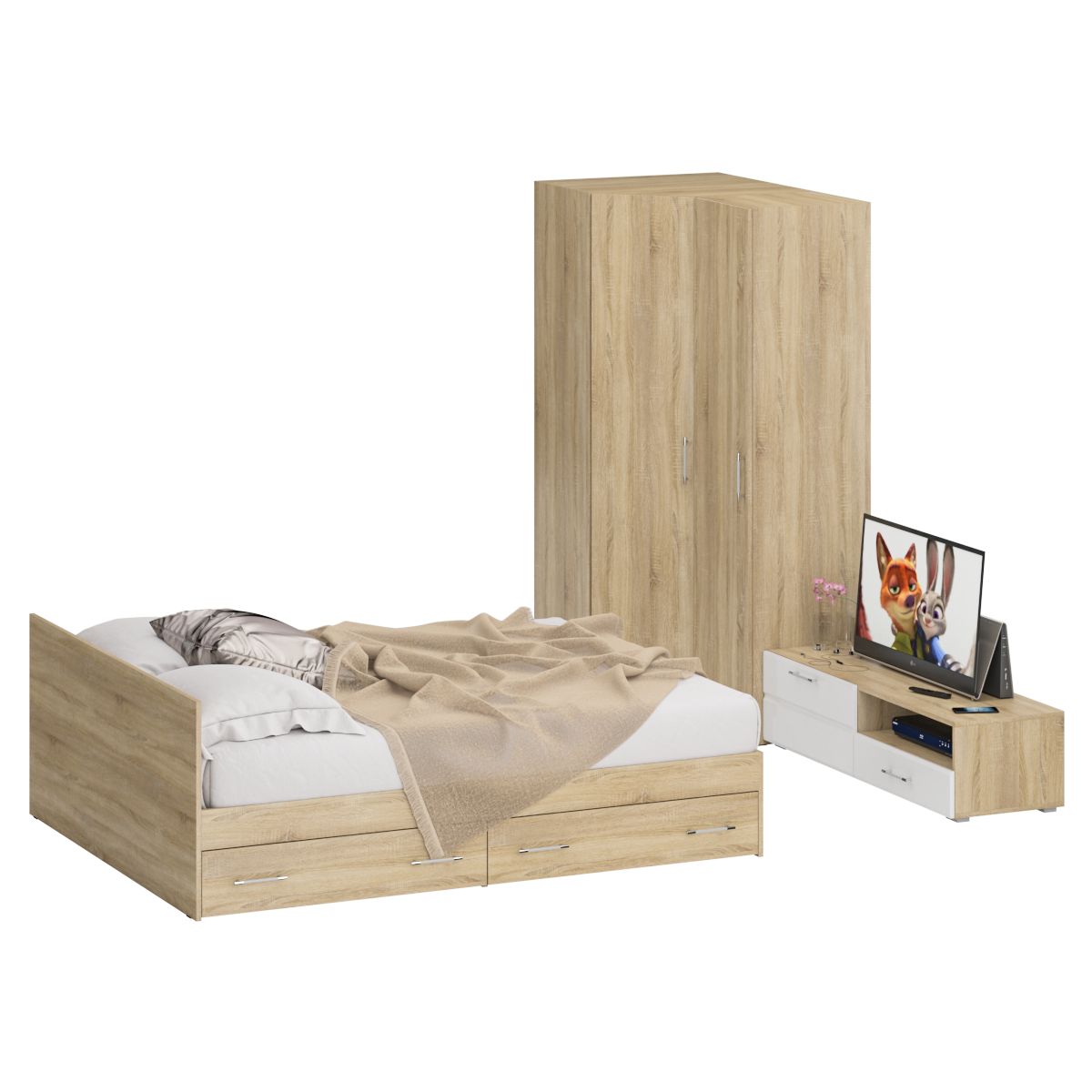 Мебель для спальни Стандарт № 4 состоит из двухспальной кровати с ящиками, объединенных в единый блок углового шкафа и пенала, и тумбы под ТВ. Функциональность, компактность и простота формы - три слагаемые дизайнерской идеи спален Стандарт. Классическая геометрия и спокойный природный тон мебели Стандарт поддержат базовый интерьер, легко сочетаясь с мебелью любого стиля. В комнату с такой нейтральной обстановкой легко добавить индивидуальности, расставив акценты с помощью креативных аксессуаров. Кровать Стандарт - надёжная, с устойчивым основанием и удобной спинкой, идеально подходит для детской комнаты. Сп.м. 1600х2000 мм, основание в комплекте (настил ДСП), матрас 1600х2000 мм. приобретается отдельно. В основании кровати расположены два вместительных ящика для хранения постельных принадлежностей и личных вещей. Определённый интерес мебель Стандарт представляет и для обустройства гостиничных номеров, пансионатов, детских лагерей. Гардеробный блок представлен угловым шкафом и пеналом. За распашной дверкой шкафа углового расположены два отделения - со штангой для одежды на плечиках и антресольной полкой с одной стороны, и нишей с тремя полками с другой. Универсальная сборка - сторону открывания двери и располажение отделений внутри шкафа - Вы определятете при сборке. Боковина шкафа углового для соединения с другой мебелью имеет глубину 52 см. Высокий пенал, за распашной дверкой которого расположены четыре съёмные полки. Универсальная дверь - сторону открывания двери Вы определятете при сборке. Тумба под ТВ придётся по вкусу любителям стильных элементов мебели в оформлении интерьера. Особый акцент данной модели - глянцевое покрытие фасадов, выполненных из МДФ 16 мм. с торцевой фрезеровкой в виде фацета и геометрической фрезеровкой откидной дверки. Линейный декор тумбы подчёркнут ручками-рейлингами, имеющих сочетанное хромированно-матовое покрытие. Конструктивно тумба разделена на два одинаковой ширины отделения. Слева расположена закрытая откидной дверкой ниша, справа - открытая ниша и выдвижной ящик. Установлена тумба на плоские, прочные и надёжные прямоугольные ножки. Пластиковые накладки на ножках защитят Ваше напольное покрытие от механических повреждений. Мебель для спальни Стандарт № 4 имеет универсальный интерьер, который будет жить вне времени и моды, без необходимости обновления. Элегантная простота и эргономичность кровати, в сочетании с идеальным качеством исполнения, обещают удовольствие на долгие годы. Мебель для спальни Стандарт № 4 выполнена из экологически чистой ламинированной ДСП с классом эмиссии Е1, допустимым для детской мебели. В производстве мебели использована фурнитура высоких стандартов и обработка деталей противоударной кромкой ПХВ. Поставляется мебель в разобранном виде в надёжной упаковке, с комплектом фурнитуры и инструкцией по сборке.