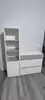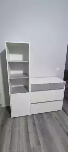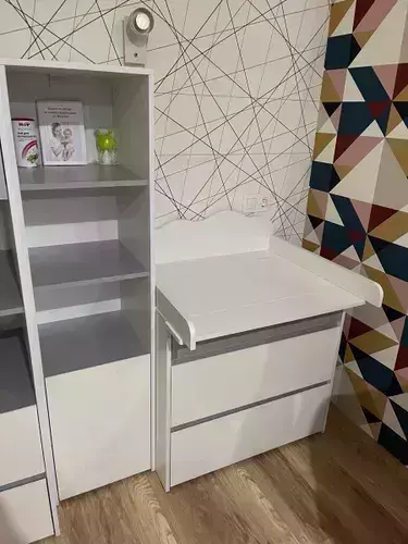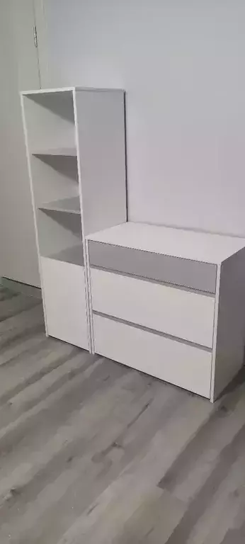Стеллаж комбинированный включает - сверху три открытые полки и снизу - полку за распашной дверкой. Универсальная сборка - сторону открывания дверцы стеллажа - Вы определяете сами. Комод состоит из трех выдвижных ящиков на шариковых направляющих полного выдвижения, позволит хранить вещи в полном порядке. Отсутствие лицевой фурнитуры и открывание фасадов за край - не только стилевое, но функциональное решение. Так мебель занимает меньше места и дает возможность проходить вплотную с фасадом без риска зацепиться за ручку или травмироваться. Базовый белый цвет, сочетаясь с акцентным серым, создаёт нейтральную основу интерьера, чтобы подчеркнуть личные вещи и аксессуары. Корпуса и фасады мебели изготовлены из экологически чистой ламинированной ДСП 16 мм, торцы окромлены ПХВ плёнкой 0,4 мм. Поставляется стеллаж с комодом Торонто в разобранном виде, надёжно упакованной в гофрокартон, с приложенной подробной инструкцией по сборке.