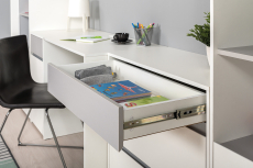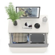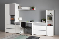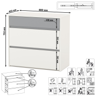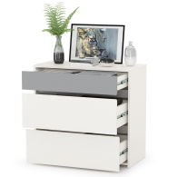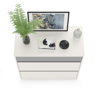 Комод состоит из трех выдвижных ящиков на шариковых направляющих полного выдвижения, позволит хранить вещи в полном порядке. Базовый белый цвет, сочетаясь с акцентным серым, создаёт нейтральную основу интерьера, чтобы подчеркнуть личные вещи и аксессуары. Отсутствие лицевой фурнитуры и открывание фасадов за край - не только стилевое, но функциональное решение. Так комод занимает меньше места и дает возможность проходить вплотную с фасадом без риска зацепиться за ручку или травмироваться. Корпус и фасады комода изготовлены из экологически чистой ламинированной ДСП 16 мм, торцы окромлены ПХВ плёнкой 0,4 мм. Поставляется комод Торонто 13.321 в разобранном виде, надёжно упакованной в гофрокартон, с приложенной подробной инструкцией по сборке. Вы можете купить комод Торонто 13.321 со скидкой при заказе через сайт в нашем магазине. Изображения комода Торонто 13.321 Вы можете найти выше в начале страницы. Комод Торонто 13.321 - элемент из набора мебели для молодежной комнаты Торонто.