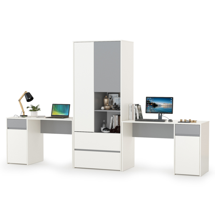 Шкаф оборудован горизонтальной штангой для одежды на плечиках за дверкой с одной стороны. С другой три полки, верхние две за распашной дверкой. В нижней части шкаф располагат двумя выдвижными ящиками на шариковых направляющих полного выдвижения обеспечивают длительную и тихую эксплуатацию. На внутренней стороне дверки отделения с штангой расположено зеркало. Шкаф для одежды Торонто 13.333 собирается на любую сторону, что позволяет расширить возможности по расстановке мебели. Распашные двери шкафа на четырёхшарнирных петлях без доводчиков. Конструктивно каждый стол включает всестительную столешницу и тумбу под ней. Тумба каждого стола имеет удобное распашное отделение с полкой внутри и выдвижным ящиком над ним на шариковых направляющих полного выдвижения. Универсальная сборка - сторону расположения тумбы Вы определяете сами. Отсутствие лицевой фурнитуры и открывание фасадов за край - не только стилевое, но функциональное решение. Так мебель занимает меньше места и дает возможность проходить вплотную с фасадом без риска зацепиться за ручку или травмироваться. Базовый белый цвет, сочетаясь с акцентным серым, создаёт нейтральную основу интерьера, чтобы подчеркнуть личные вещи и аксессуары. Корпуса и фасады мебели изготовлены из экологически чистой ламинированной ДСП 16 мм, торцы окромлены ПХВ плёнкой 0,4 мм. В производстве молодёжной Торонто использованы качественные материалы и фурнитура - можно разрабатывать проект на весь период обучения. Поставляется компьютерные столы и шкаф для одежды Торонто № 17 в разобранном виде, надёжно упакованной в гофрокартон, с приложенной подробной инструкцией по сборке.