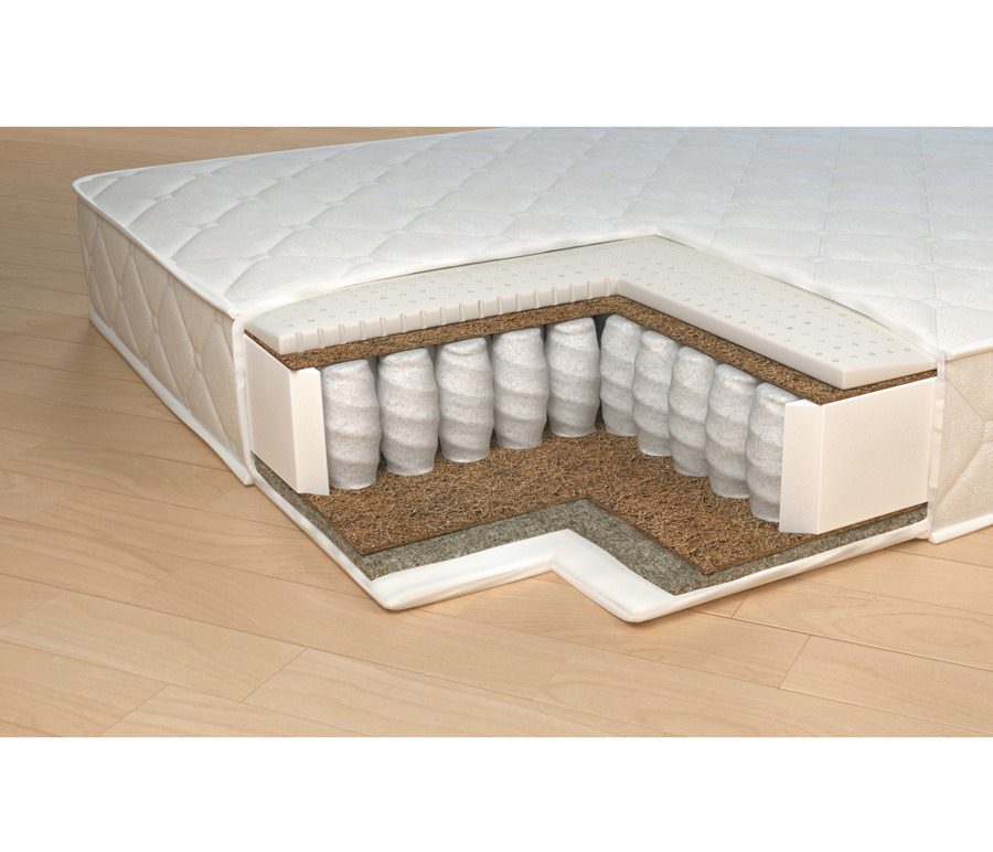 С обеих сторон матраса в качестве комфортного слоя используется 2 см искусственного латекса, этот материал очень долговечный и упругий, благодаря этому слою на этом матрасе будет одинаково комфортно людям разных весовых категорий. Для распределения нагрузки и придания необходимой жесткости используется латексированный кокосовый лист, который кладется под латекс. В основе матраса лежит блок независимых пружин, благодаря которому матрас будет индивидуально подстраиваться под каждого спящего и оказывать обратное давление только там, где это действительно необходимо. Чехол матраса сделан из плотного мягкого трикотажа, который стегается на 15 мм пене и синтепоне, что добавляет не много мягкости. Обращаем ваше внимание на то, что любой матрас отвечает за правильность положения во время сна нижнего и среднего отделов позвоночника, а за правильность положения шейного отдела отвечает правильно подобранная ортопедическая подушка. Рекомендуем использование с защитным чехлом AquaStop. |